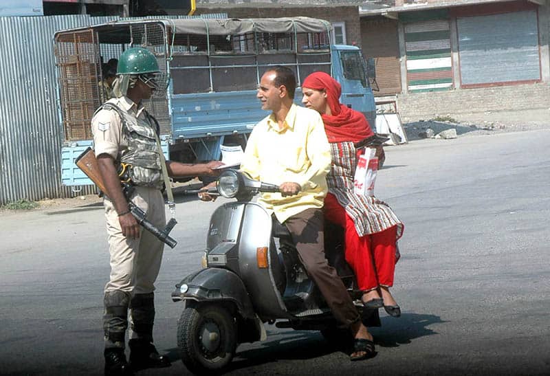 SRINAGAR, SEP 10 (UNI):- Security personnel questioning scooterists at Nowhatta road in down town Srinagar as restrictions remain in place in major parts of Kashmir valley aimed separatist strike call on the 64th consecutive day on Saturday. UNI PHOTO-14U