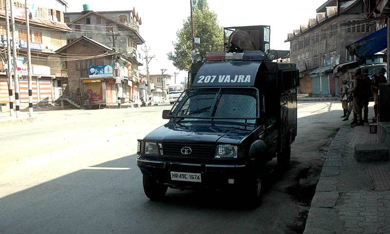 SRINAGAR, SEP 10 (UNI):- A multi barrel tear smoke vehicle stationed at Nawakadal on Nallamar road in down town Srinagar to contain protesters as restrictions remain in place in major parts of Kashmir valley aimed separatist strike call on the 64th consecutive day on Saturday. UNI PHOTO-13U