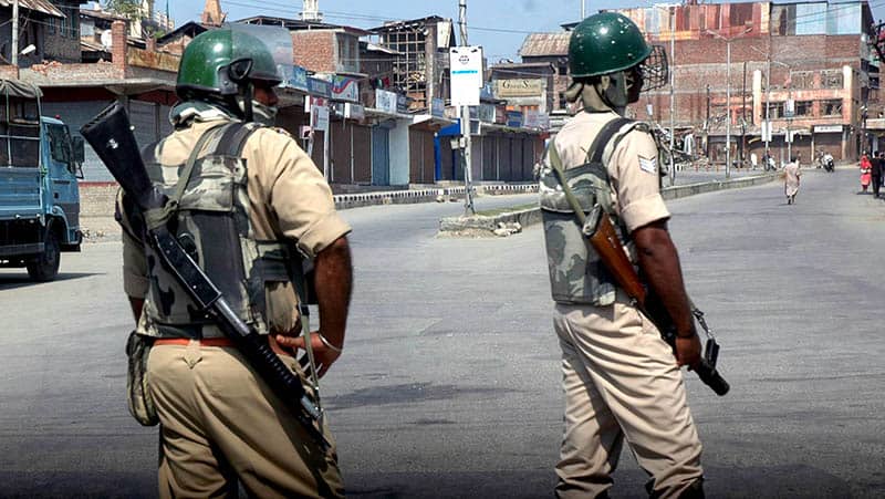 Security personnel maintain vigil at Nowhatta in down town Srinagar as restrictions remain in place in major parts of Kashmir valley aimed separatist strike call on the 64th consecutive day on Saturday. UNI PHOTO