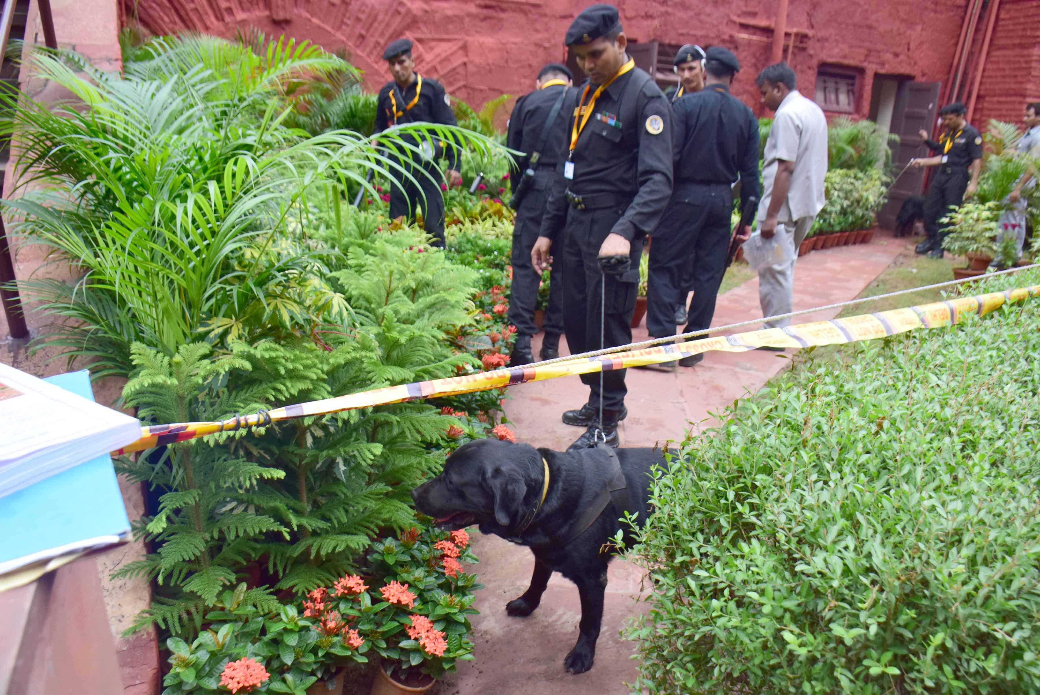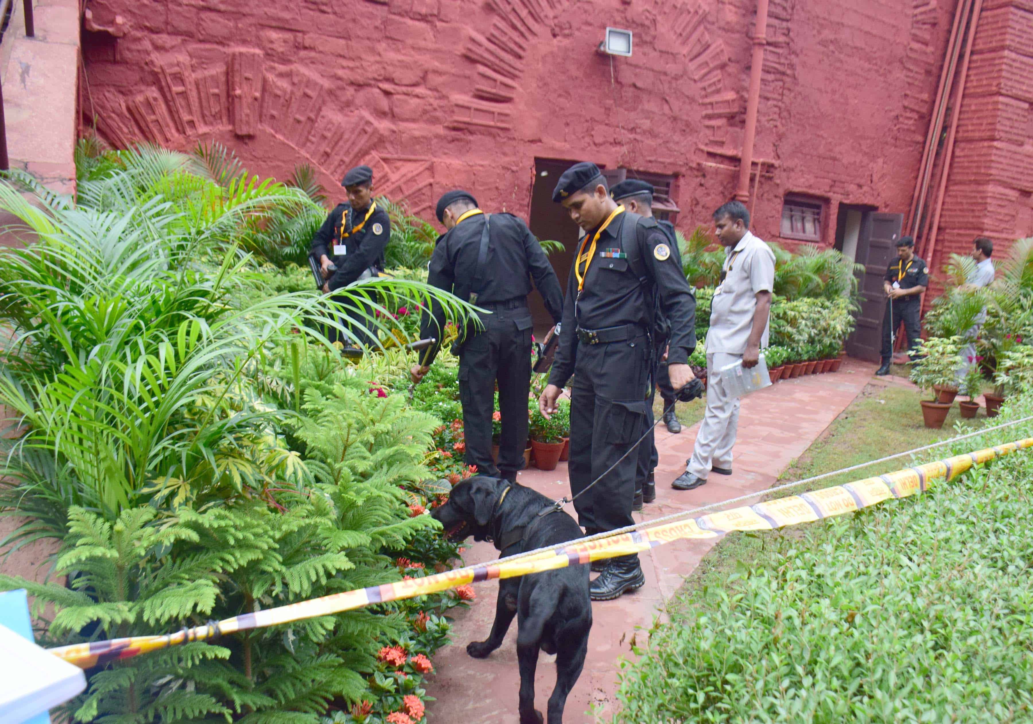 NEW DELHI, AUG 13 (UNI):-Security personnel with snifer dog searching the premises of Red Fort ahead of the 70th Indepedence Day celebration in New Delhi on Saturday. UNI PHOTO-5U