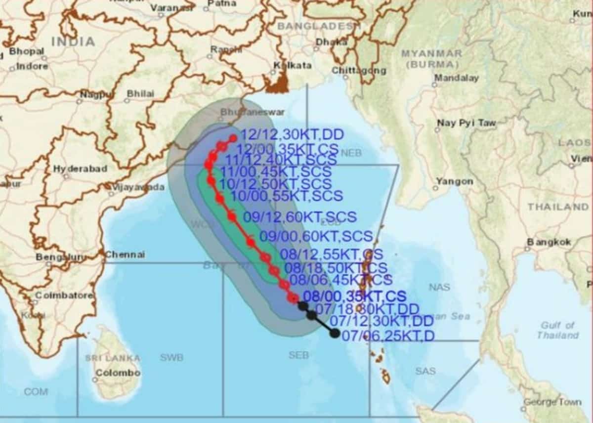 The severe cyclonic storm lay centred about 920 km northwest of Car Nicobar (Nicobar Islands), 770 km west-northwest of Port Blair (Andaman Islands), 500 km southeast of Visakhapatnam (Andhra Pradesh) and 650 km south of Puri (Odisha).