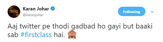 The witty filmmaker managed to engage in some funny wordplay with the name of the song, referring to the Twitter chaos. He wrote, “Aaj twitter pe thodi gadbad ho Gayi but baaki sab #firstclass hai.”