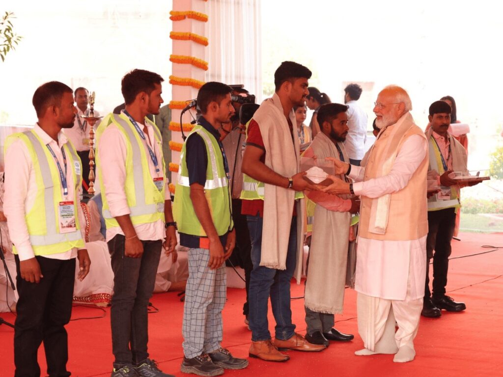 The prime minister felicitated with shawls and souvenirs some of the workers for their key role in the construction of the new Parliament building.