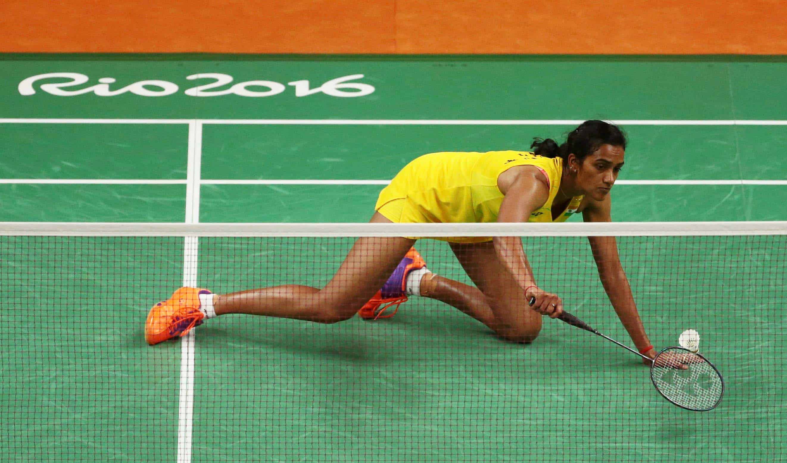 RIO DE JAMEIRO, BRAZIL – 19/08/2016. P V Sindhu of India goes on her knees to return a shot to Carolina Marin of Spain during the Badminton – Women’s Singles – Gold Medal Match. REUTERS-24r