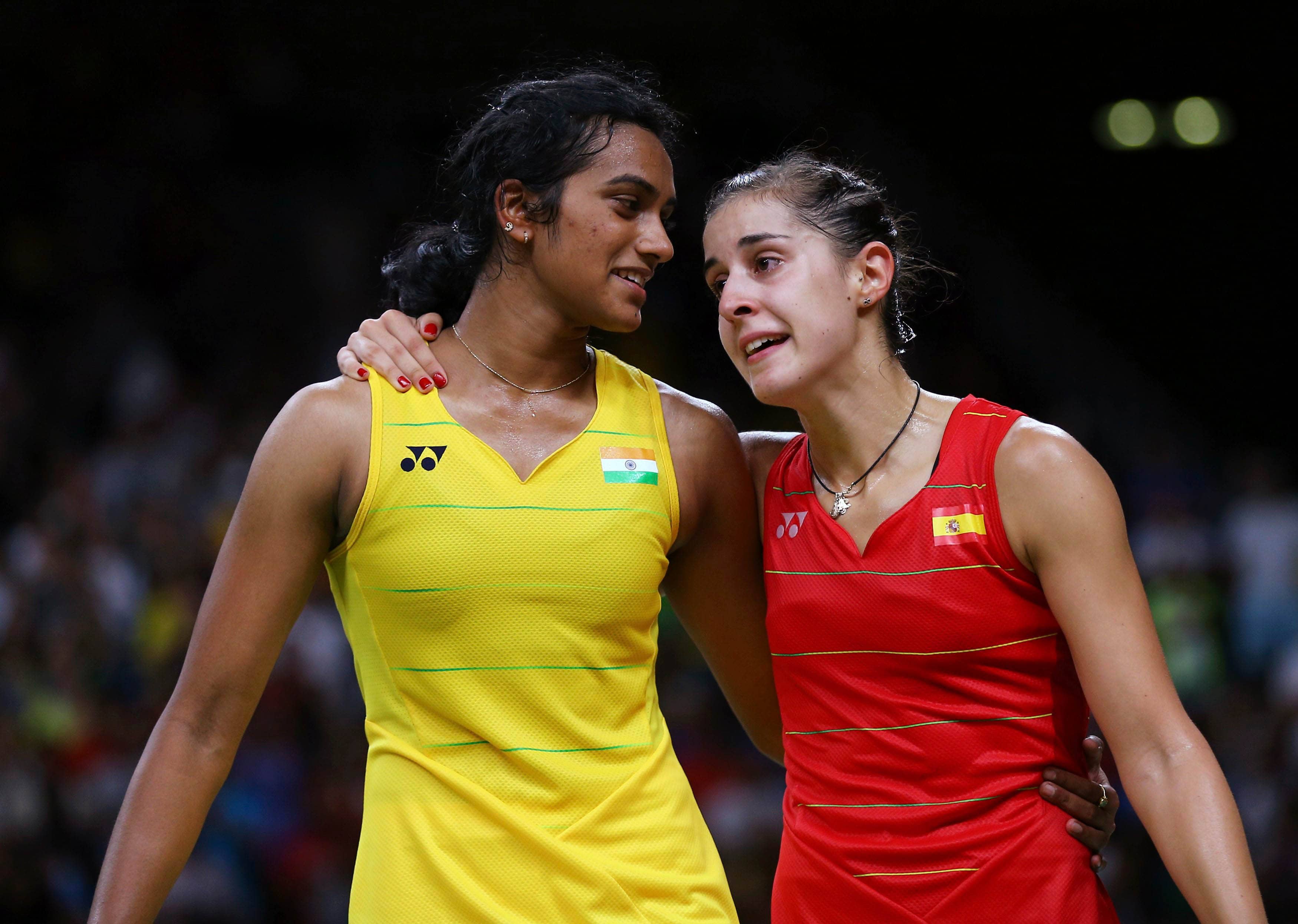 RIO DE JAMEIRO, BRAZIL – 19/08/2016. Carolina Marin (ESP) of Spain talks with P.V. Sindhu (IND) of India after winning their match. REUTERS-28r