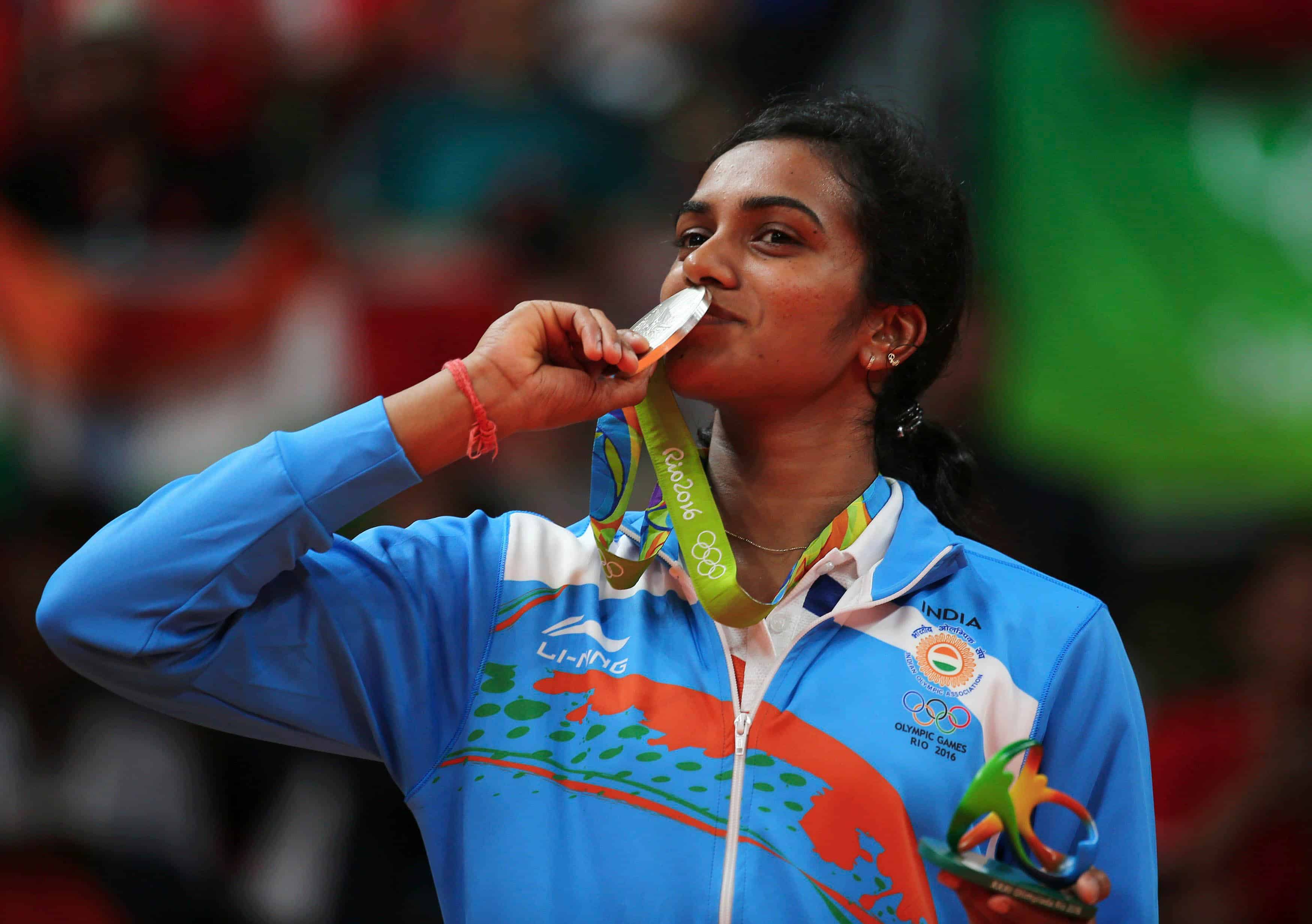 RIO DE JAMEIRO, BRAZIL – 19/08/2016. Silver medallist P.V. Sindhu of India poses kissing her medal.REUTERS-29r