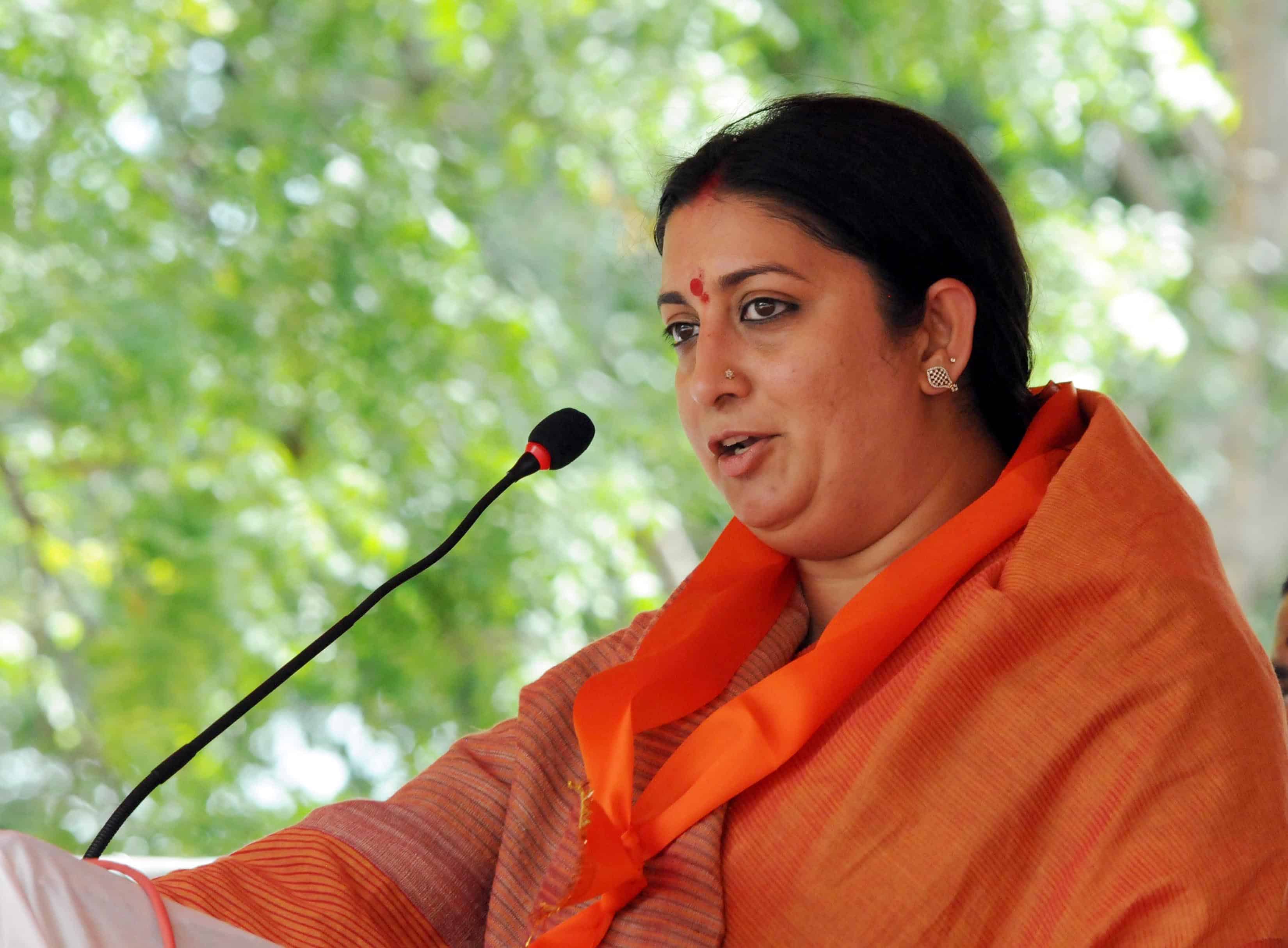 VIDURASHWATHA, GOWRIBINDNUR, KARNATAKA, AUG 23 (UNI):- Union Textile Minister Smriti Irani addressing a public rally during the BJP Tiranga Yatra as part of 70th Independence Day celebration at Vidurashwatha, Gowribindnur in Karnataka on Tuesday. UNI PHOTO – 150U