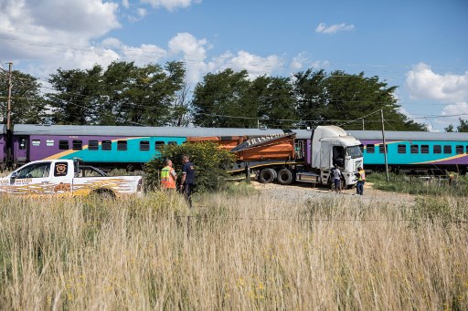 Emergency service workers stand near the site where a train crashed into truck on January 4, 2018, in Kroonstad, Free State Province. At least 12 people were killed and 180 injured in South Africa on January 4 when a passenger train collided with a truck and burst into flames, an official said, as rescuers searched for survivors. AFP