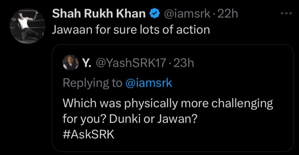 Another user asked Shah Rukh Khan which was physically more challenging for him ‘Dunki’ or ‘Jawaan’. SRK gave a categorical reply as he said, “‘Jawaan’ for sure lots of action”.