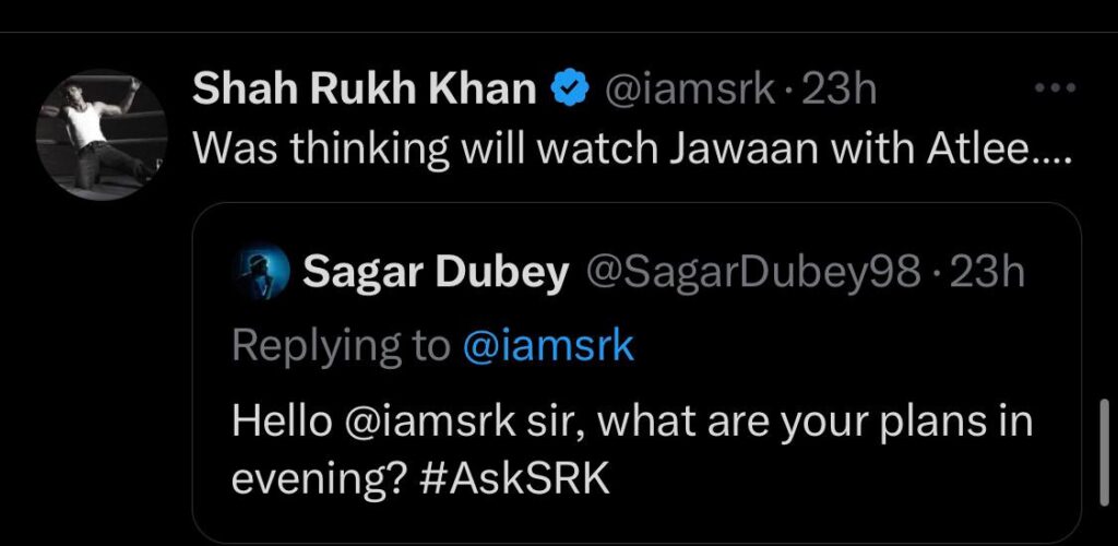 One Twitter user asked SRK about his evening plan for the day, to which the actor replied, “Was thinking will watch ‘Jawaan’ with Atlee”.