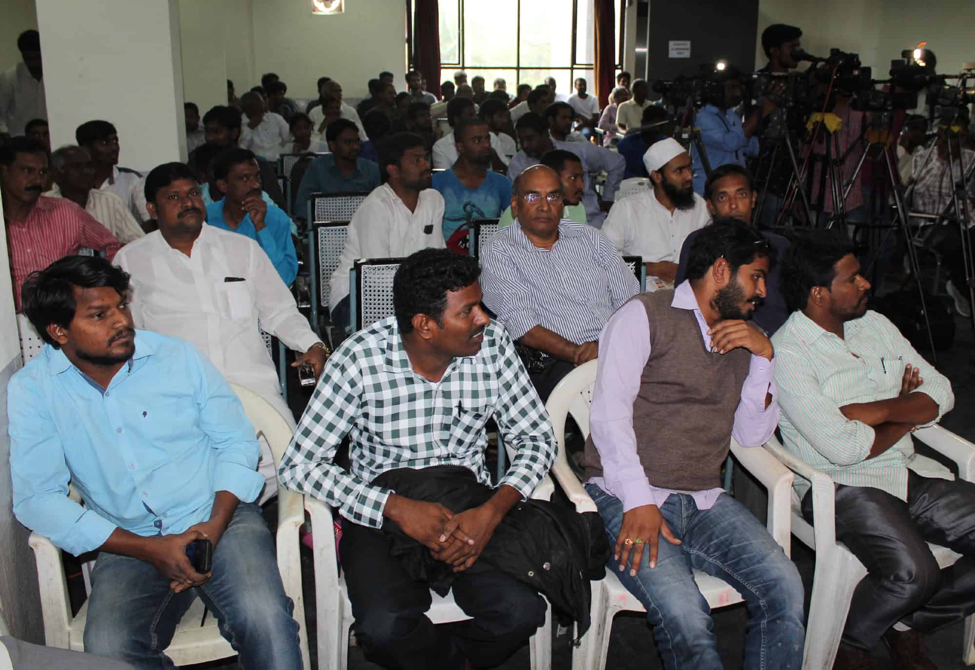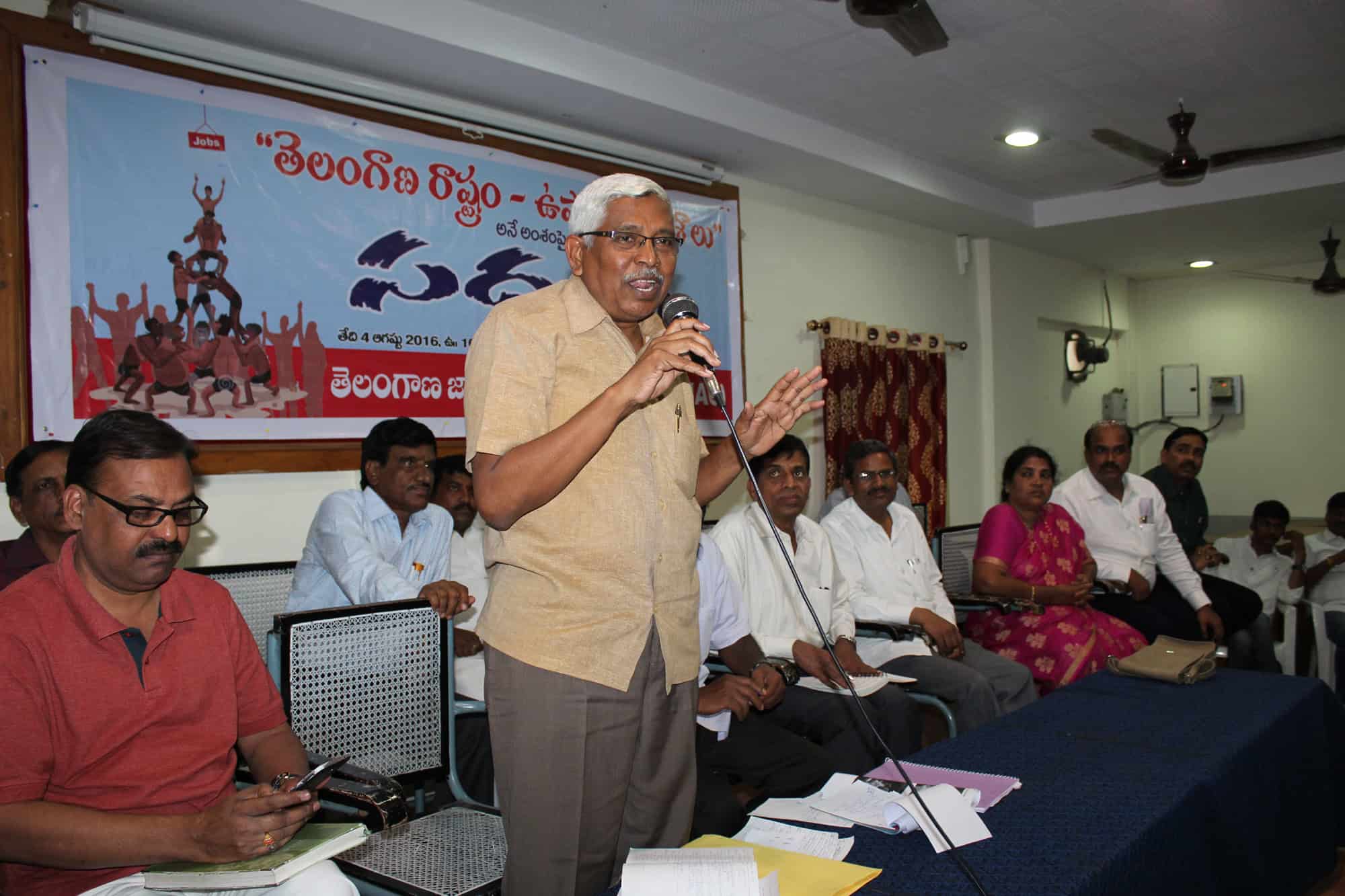 TJAC Chairmen Professor Kodana Ram is seen addressing at S V Kendram Hall during state level seminar on “Telangana State and Employment Reforms”. DP Reddy, Pithala Ravindra and others can also be seen. (Photo: Zabi)