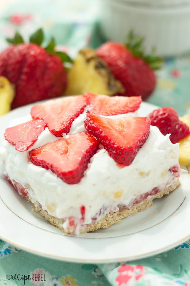 Line a 9×13″ pan with a single layer of graham crackers (left whole, unless you need to break them to fit the pan). Top with a single layer of sliced strawberries.