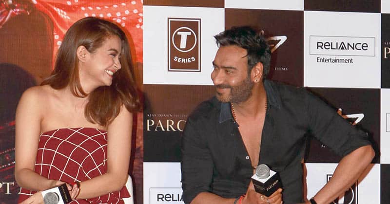 Bollywood actors Surveen Chawla with Ajay Devgan during the press conference of film ‘Parched’ in Mumbai on Monday night. UNI PHOTO
