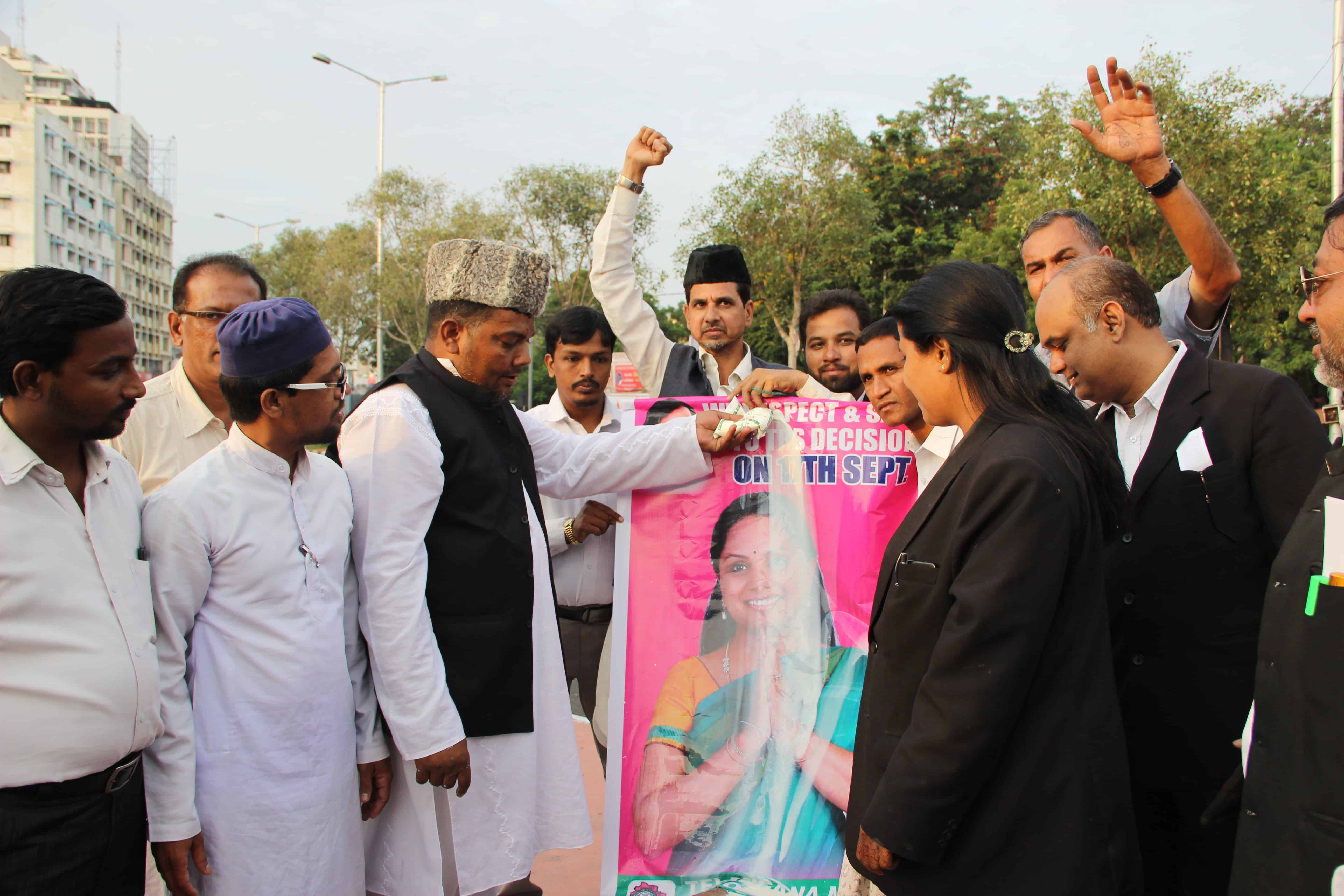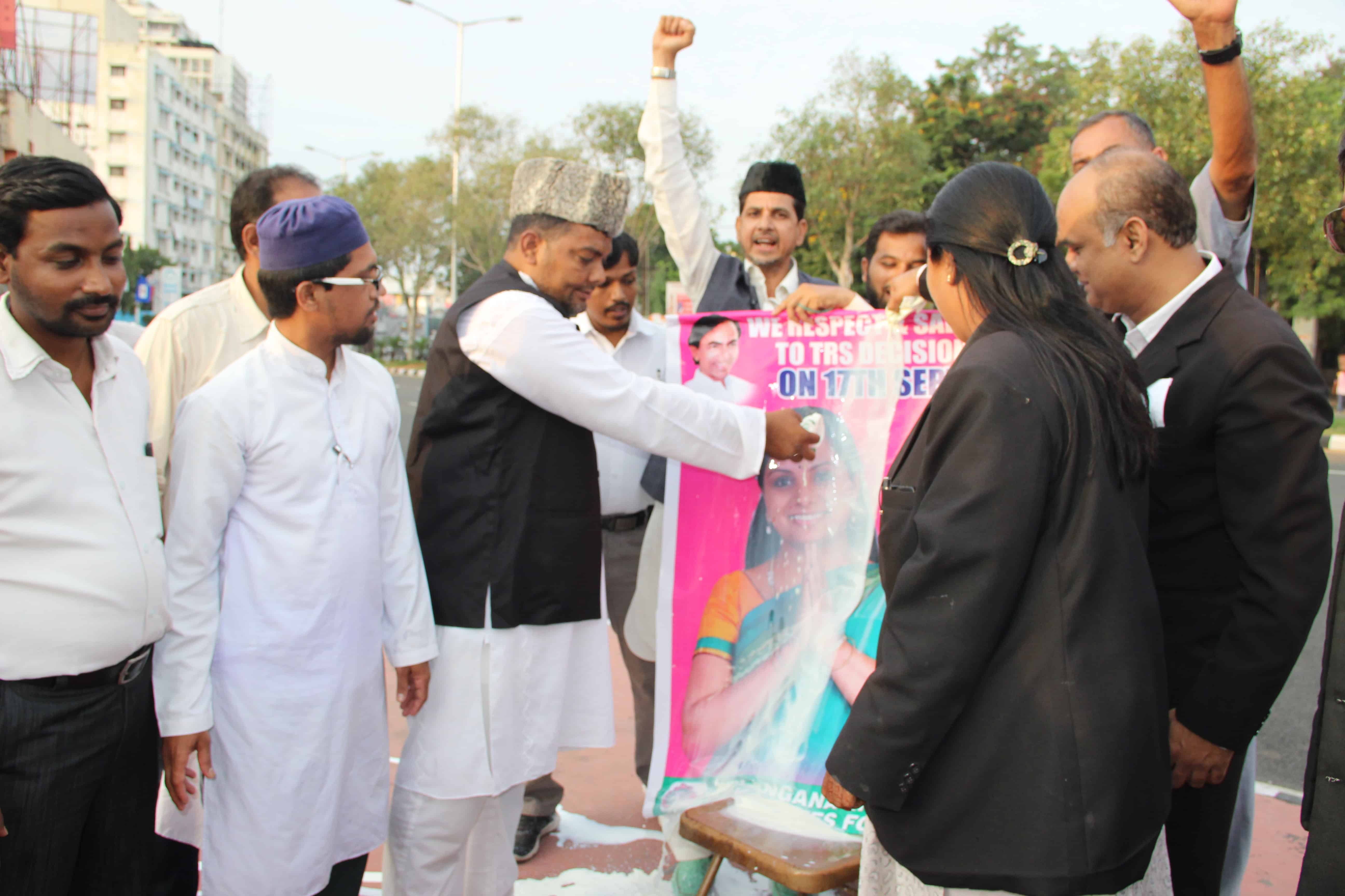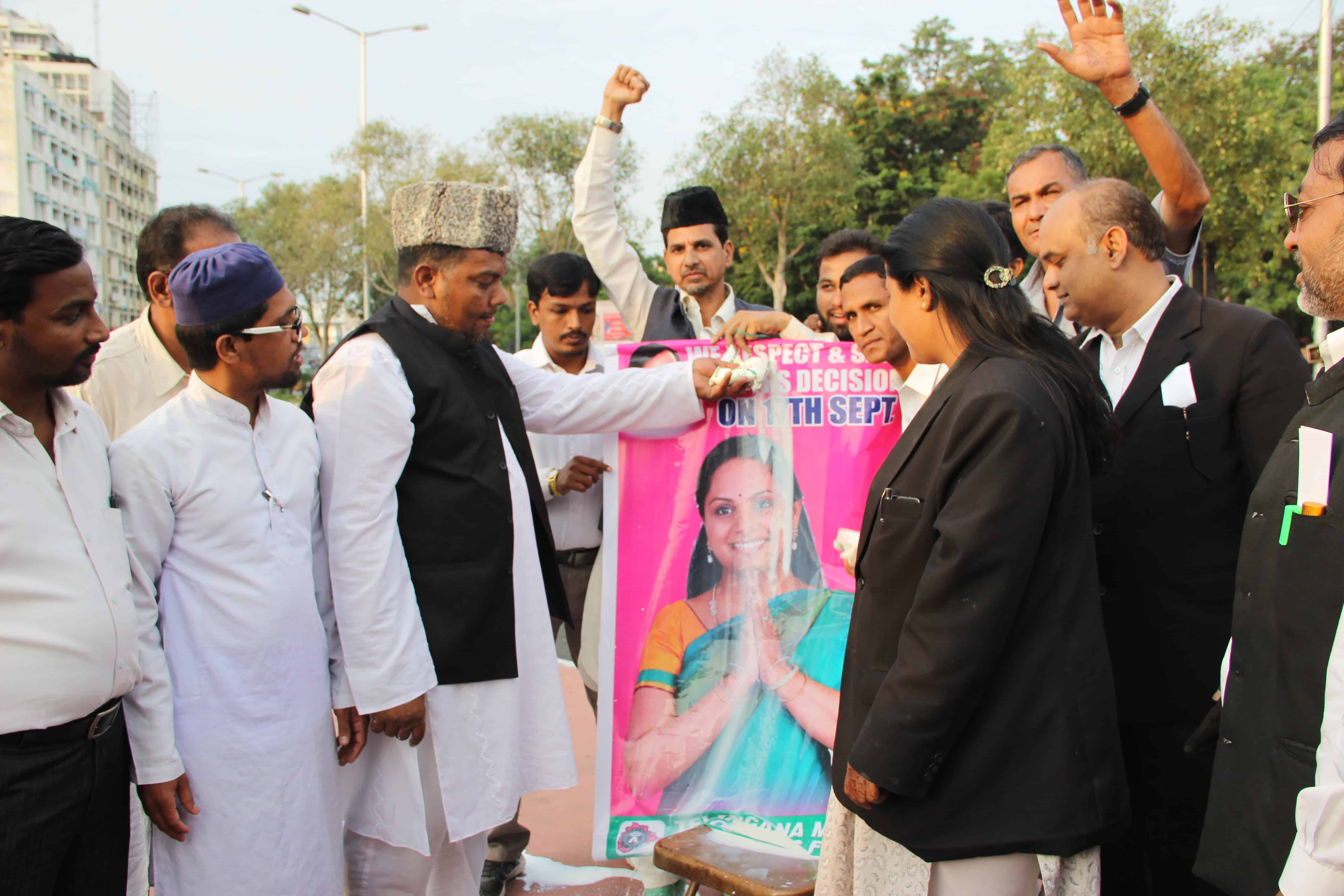 Members of Telangana Muslim Advocates Forum can be seen pouring milk over Nizamabad MP Kavita Kalvakuntala portrait to appreciate her decision against Liberation Day on 17 September. Photo:Laeeq