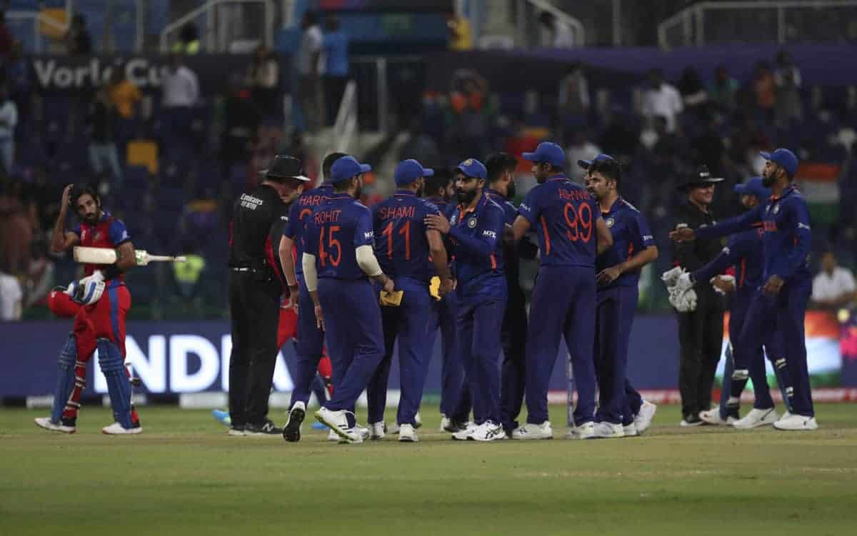 Abu Dhabi: India’s Ravichandran Ashwin, without cap, celebrates with teammates after dismissing Afghanistan’s Gulbadin Naib during the Cricket Twenty20 World Cup match between India and Afghanistan in Abu Dhabi, UAE, Wednesday, Nov. 3, 2021.AP/PTI Photo