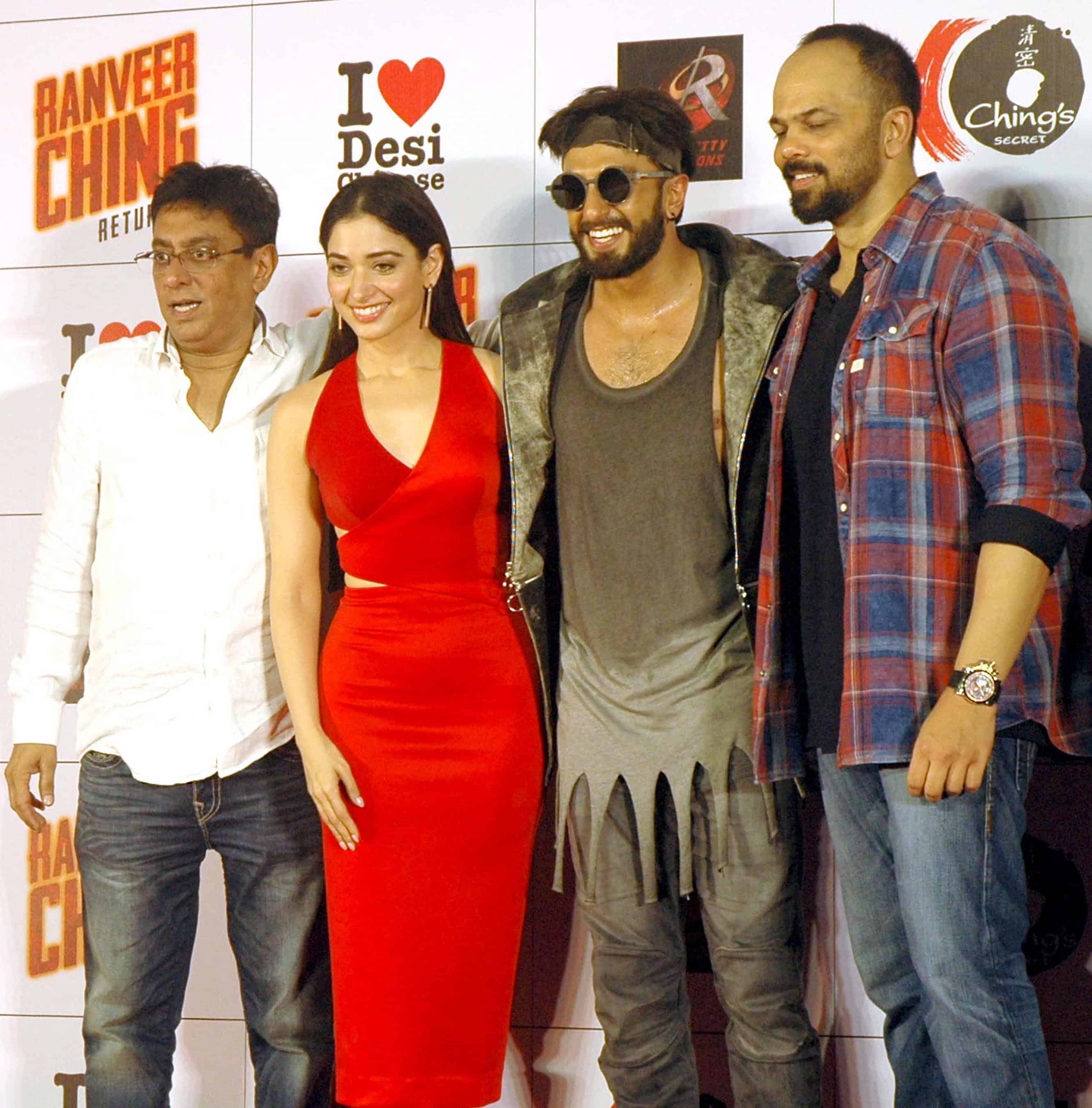 MUMBAI, AUG 20 (UNI):- (L-R) Ching’s Secret founder Ajay Gupta, Bollywood actors Tamanah Bhatia, Ranveer Singh and film-maker Rohit Shetty during the premiere of Ad film Ranveer Ching Returns : Desi Chinese, in Mumbai on Friday night. UNI PHOTO – 38U