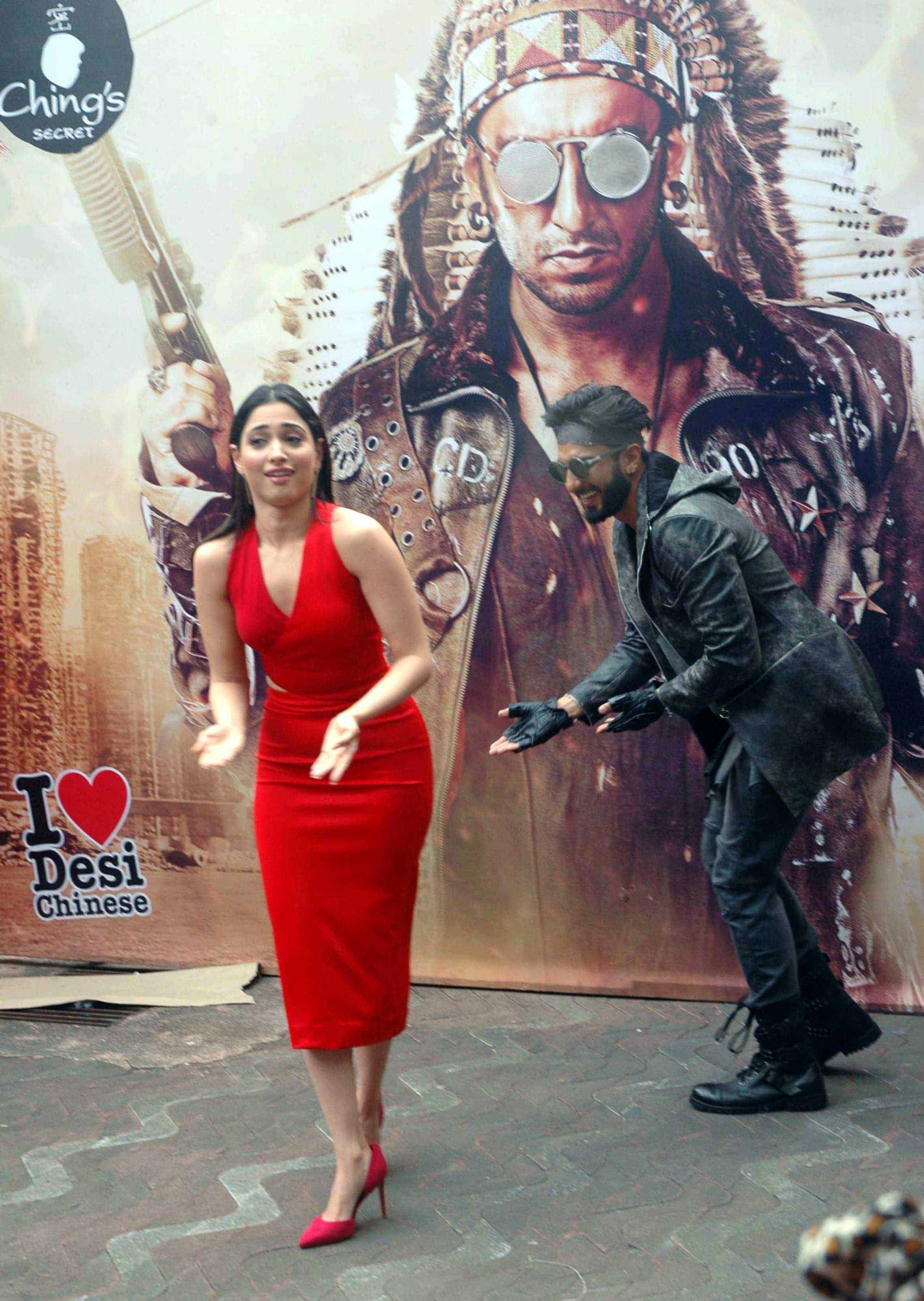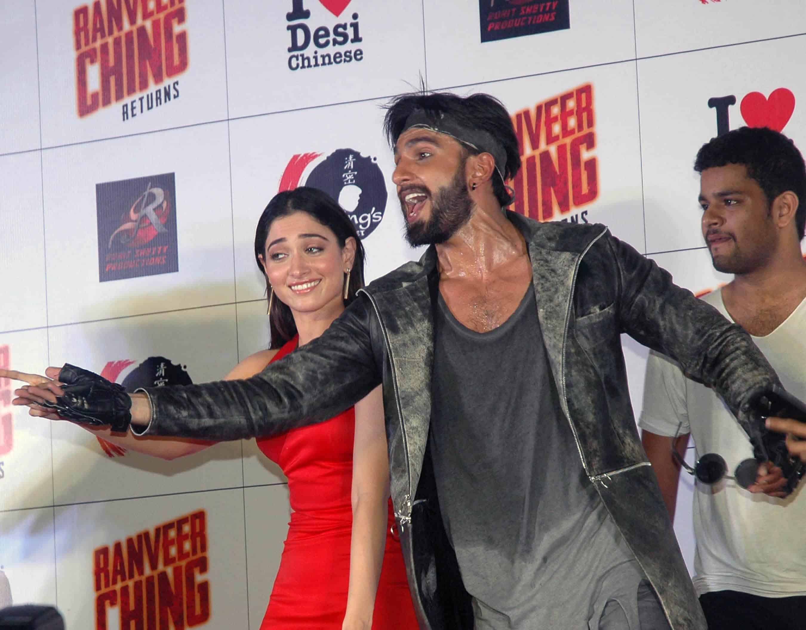 MUMBAI, AUG 20 (UNI):- Bollywood actors Tamanah Bhatia and Ranveer Singh during the premiere of Ad film Ranveer Ching Returns : Desi Chinese, in Mumbai on Friday night. UNI PHOTO-39U