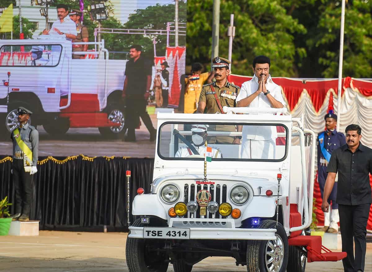 Chennai: Tamil Nadu Chief Minister M K Stalin takes the salute of the parade at the police medal distribution function, in Chennai, Friday, May 27, 2022. (PTI Photo/R Senthil Kumar)
