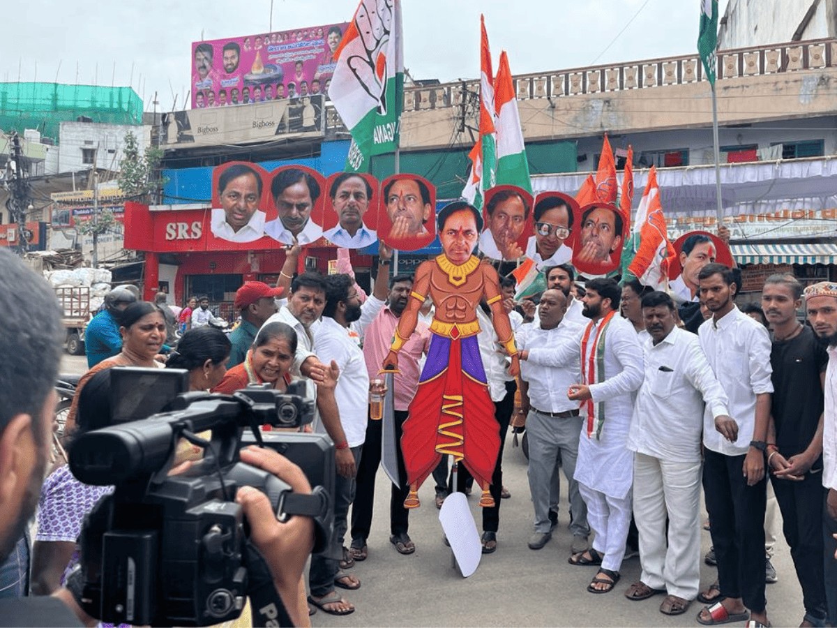 The Congress had asked its supporters to burn effigies representing CM KCR, likening him to Dashanana Ravanasura with 10 heads, each symbolising a broken election promise.