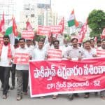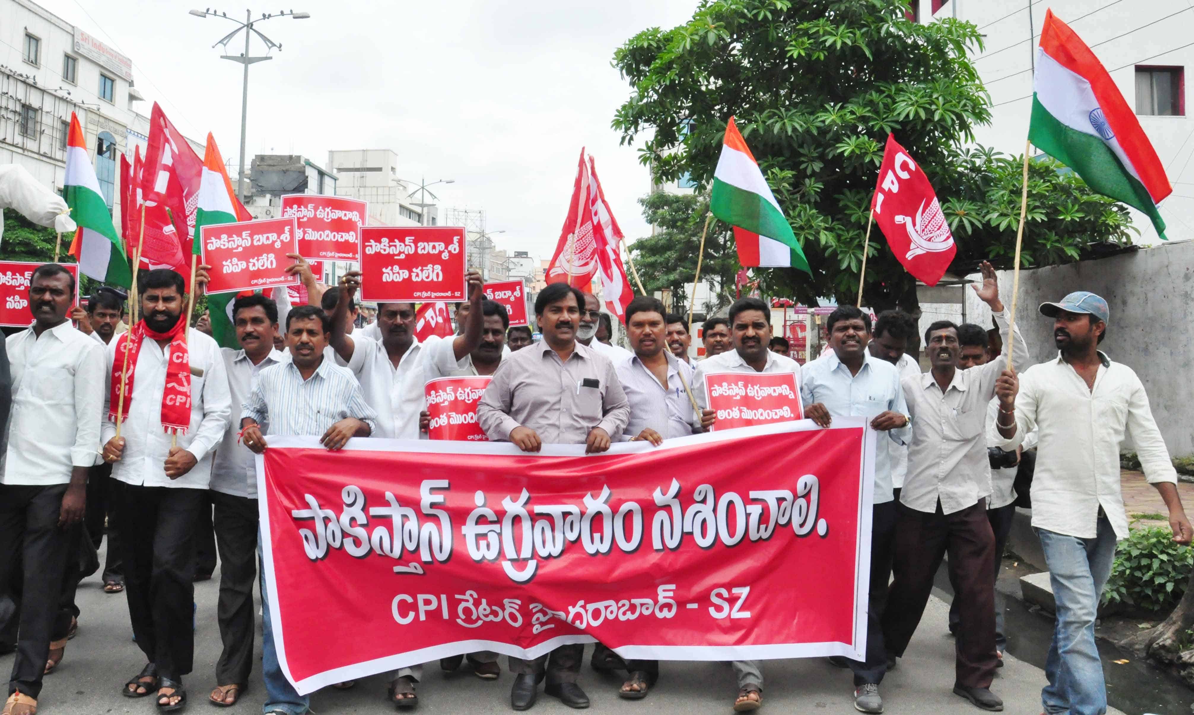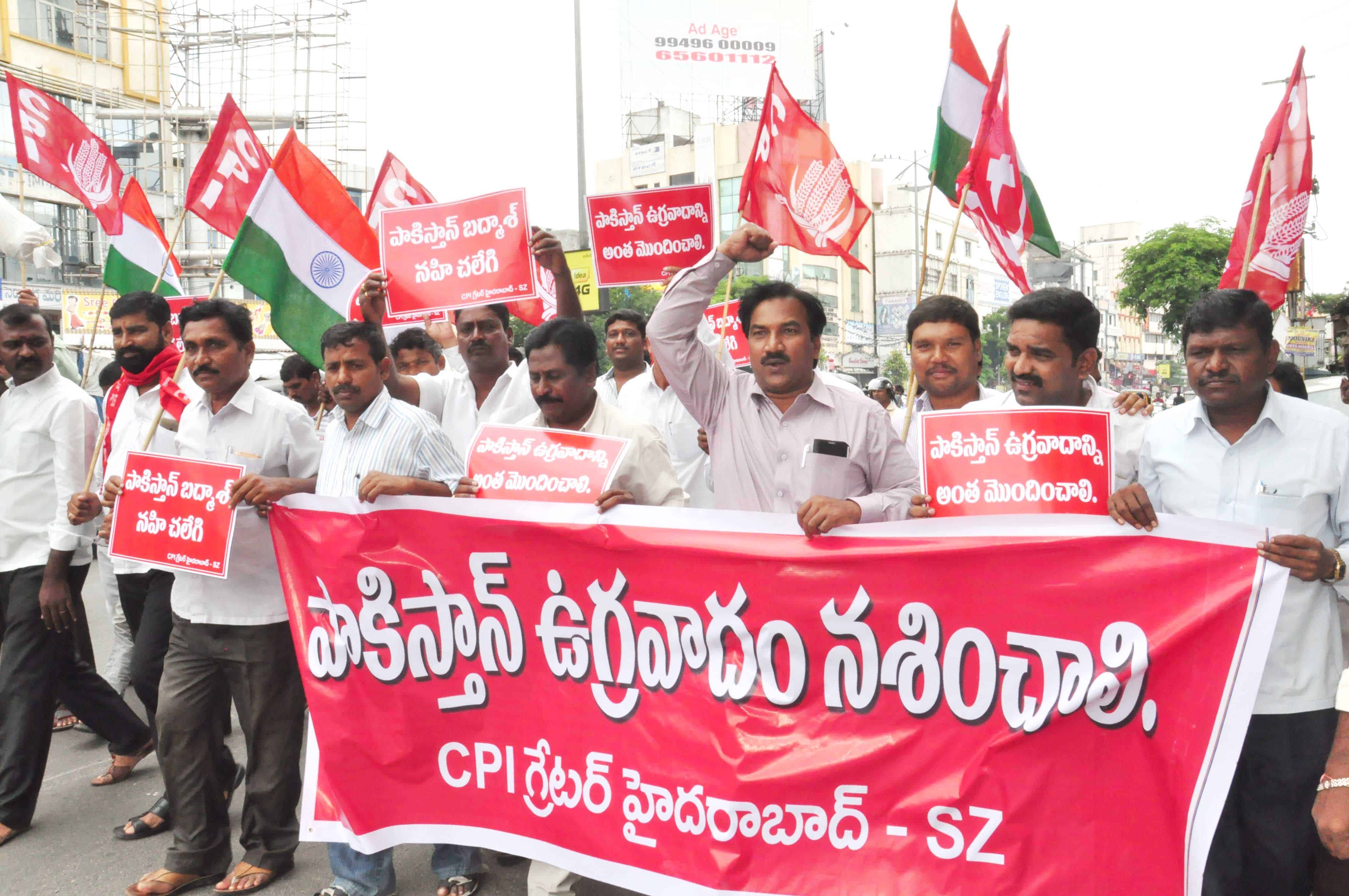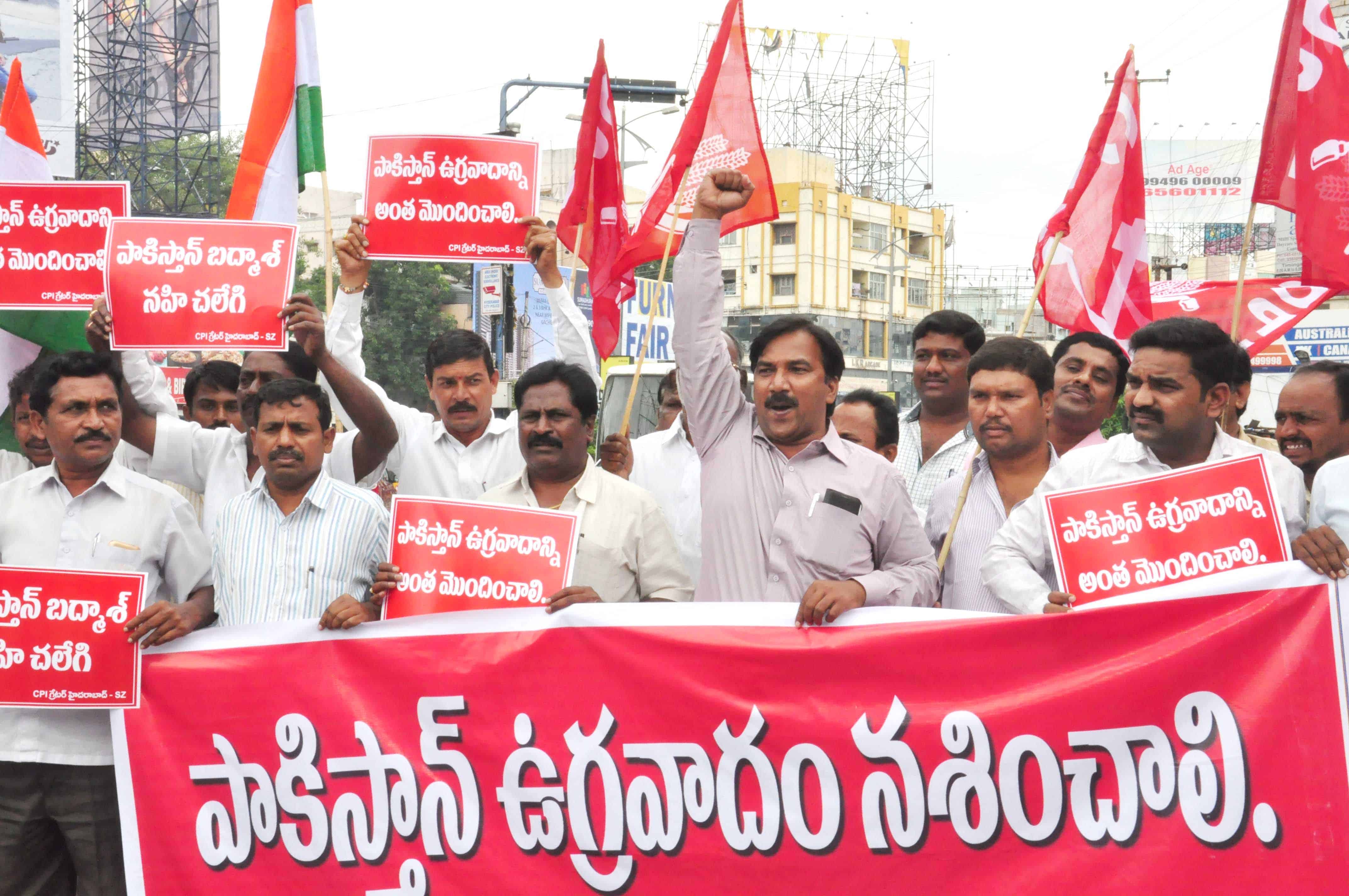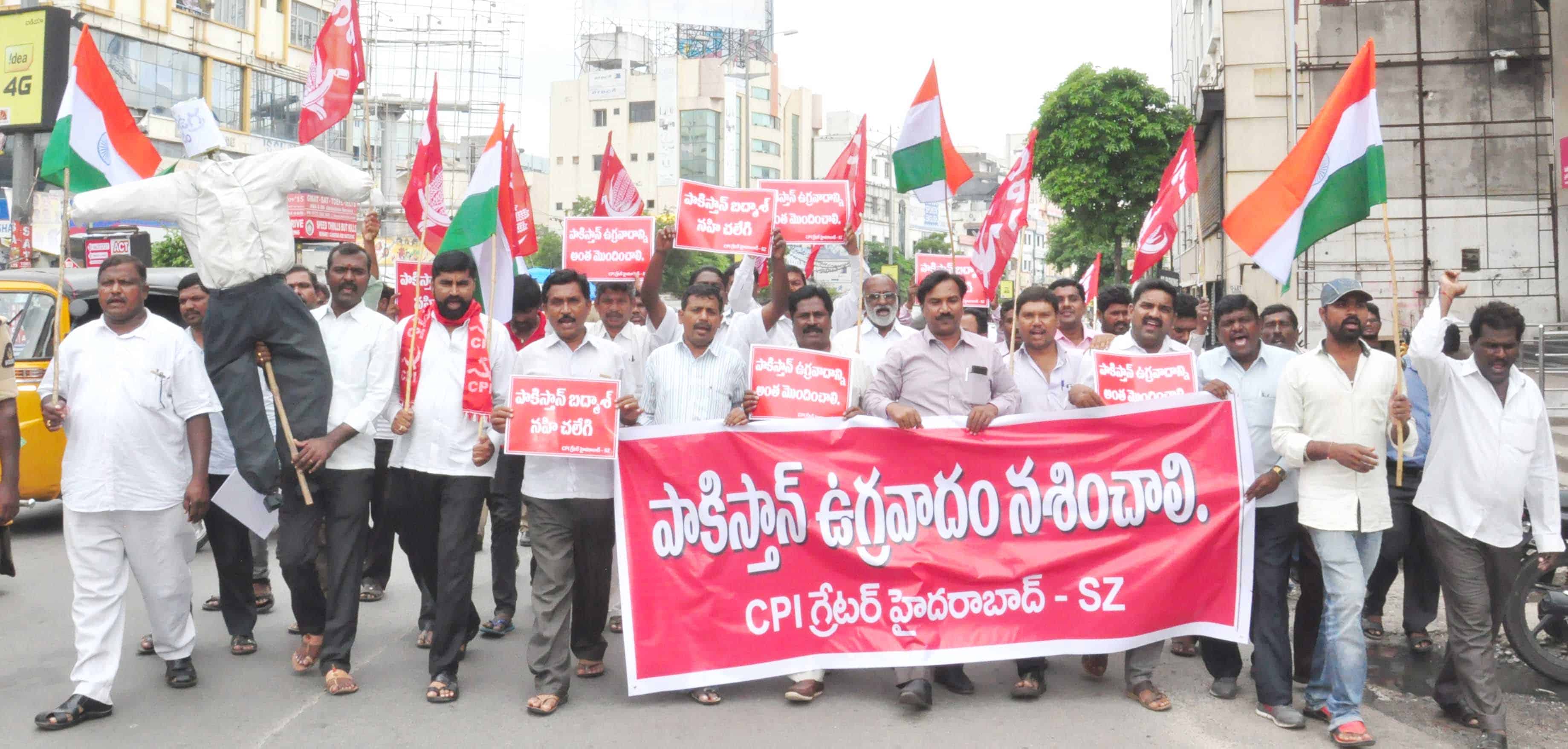 CPI Greater Hyderabad South Zone burnt terrorist effigy at Himayath Nagar Circle to condemn Kashmeer attack. (Photo: Zabi)