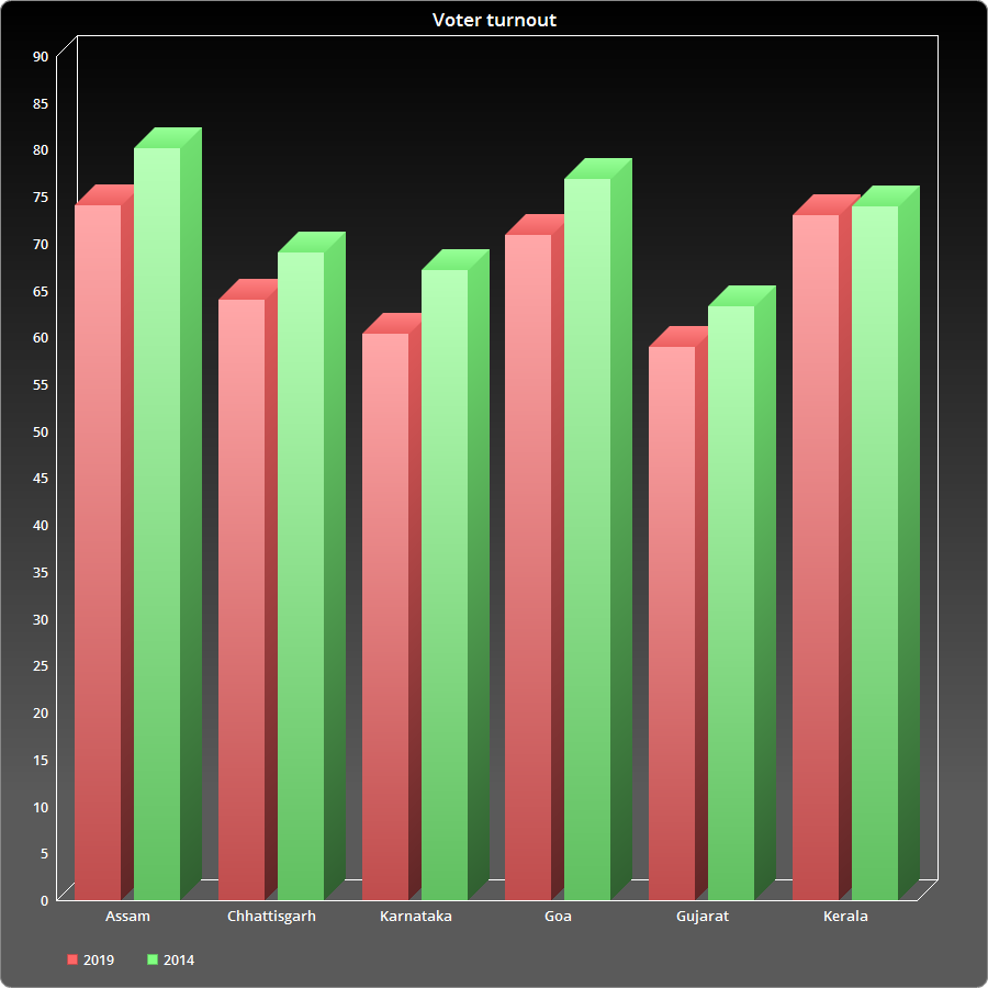 The interim polling percentage was 74.05 per cent in Assam compared to 80.21 per cent in 2014, Chhattisgarh 64.02 per cent (69.01 per cent in 2014), Karnataka 60.42 (67.2 per cent in 2014), Goa 70.9 per cent (76.86 in 2014), Gujarat 59 per cent (63.34 in 2014), Kerala 73.06 per cent (74.02 in 2014), West Bengal 78.97 per cent, Tripura 79.64 per cent (83.02 in 2014), Bihar 60 (59.08 in 2014), Maharashtra 62 per cent (62.86 in 2014), Odisha 64 per cent (73.75 in 2014) and Uttar Pradesh 60.52 per cent (61.48 in 2014).