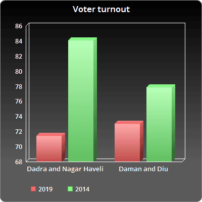The polling percentage was 71.43 per cent in Dadra and Nagar Haveli (84.08 in 2014) and 73 per cent in Daman and Diu (77.84 in 2014).