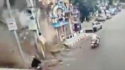 The video, recorded Wednesday evening, shows a burka-clad woman walking in a hurry in front of the temple. As she was passing by the old structure, it suddenly collapsed. She moved swiftly and it was only a fraction of a second which made the difference.