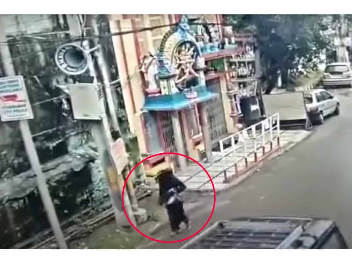 The video, recorded Wednesday evening, shows a burka-clad woman walking in a hurry in front of the temple. As she was passing by the old structure, it suddenly collapsed. She moved swiftly and it was only a fraction of a second which made the difference.