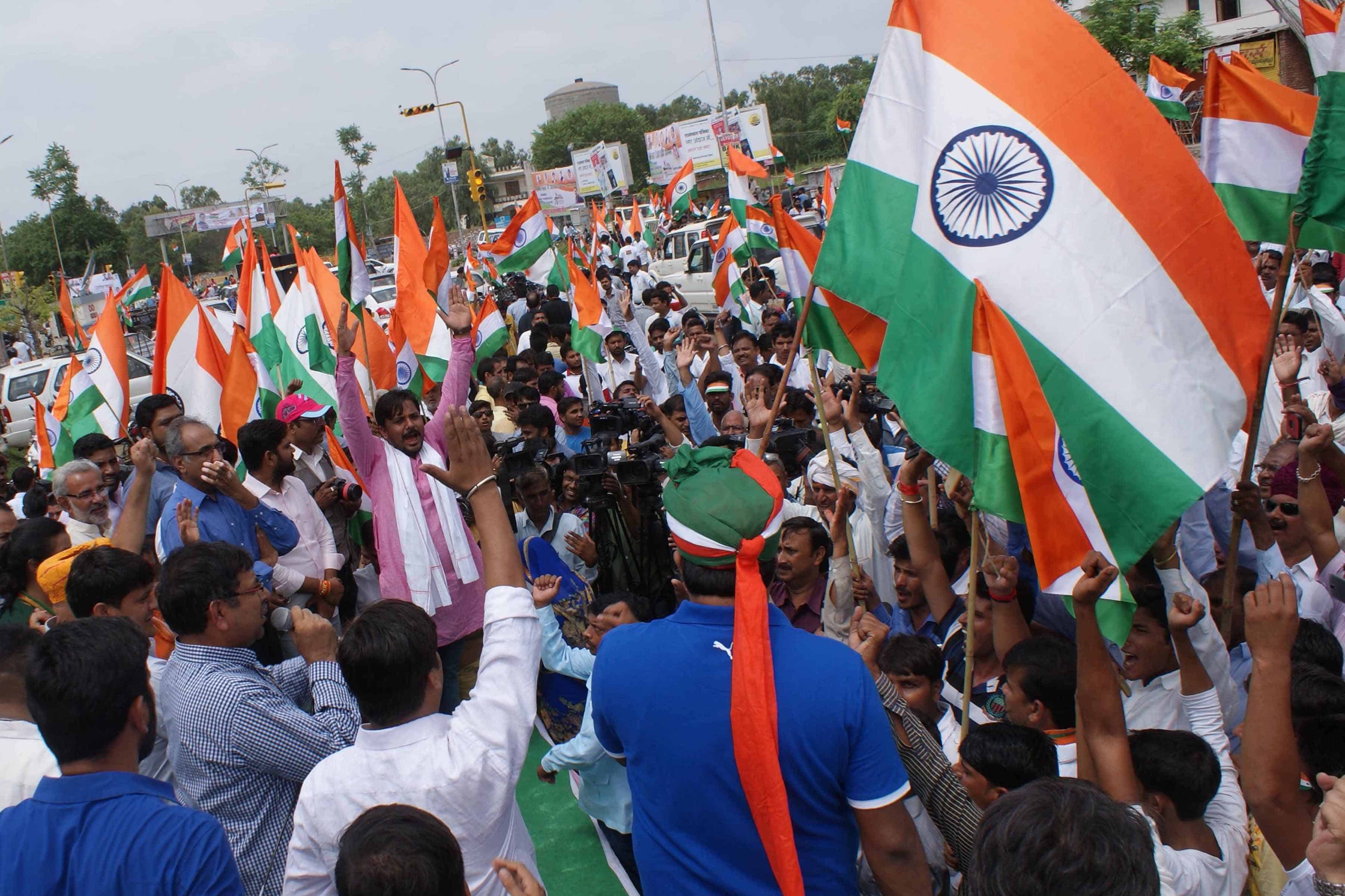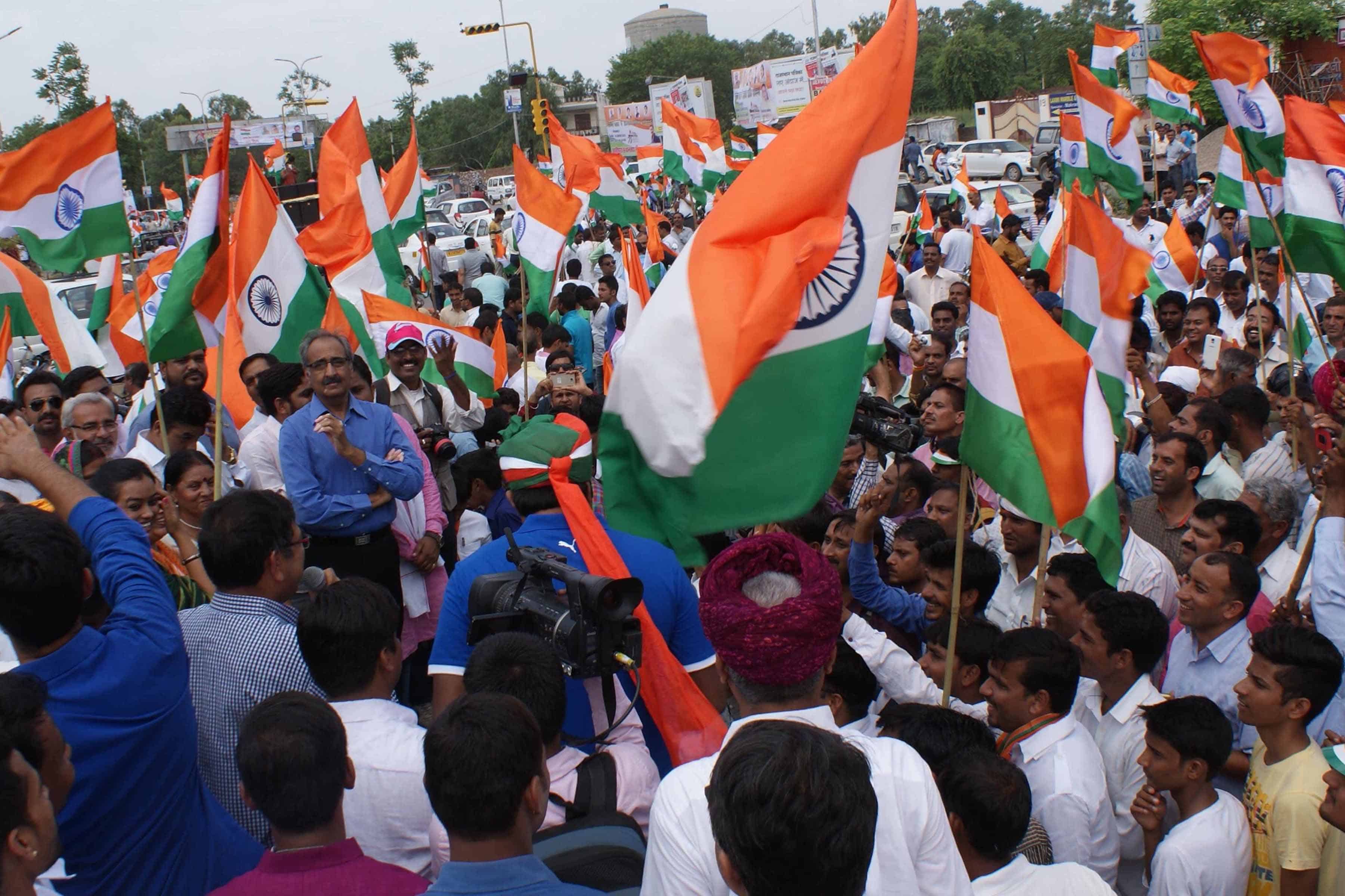 BJP activists participate in Tiranga Yatra. The yatra was flagged off by union ministers Piyush Gohel and Rajyvardhar Rathore in Jaipur on Tuesday. UNI PHOTO