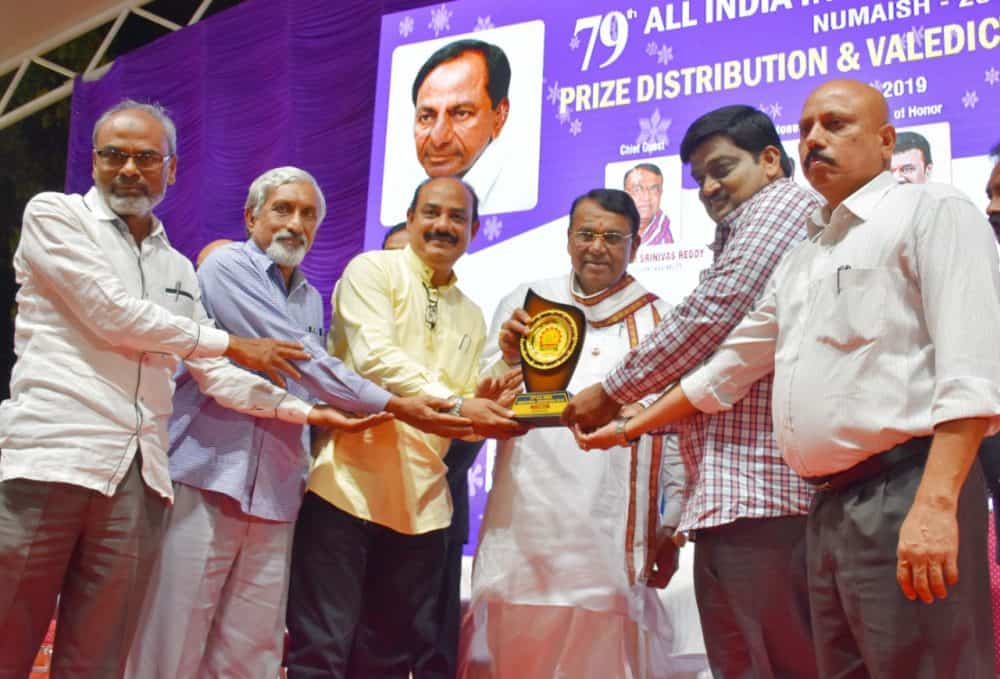 Sri. Pocharam Srinivas Reddy Speaker Telangana State Legislative assembly gave the 1st prize for TMREIS stall at 79th All India Industrial Exhibition, 2019. In pic: Shaik Liyakhat Hussain Joint Secretary TMREIS, Dilawar Ali Deputy Secretary TMREIS, Syed Nayeemuddin Accounts officer TMREIS and others have also seen in pic.