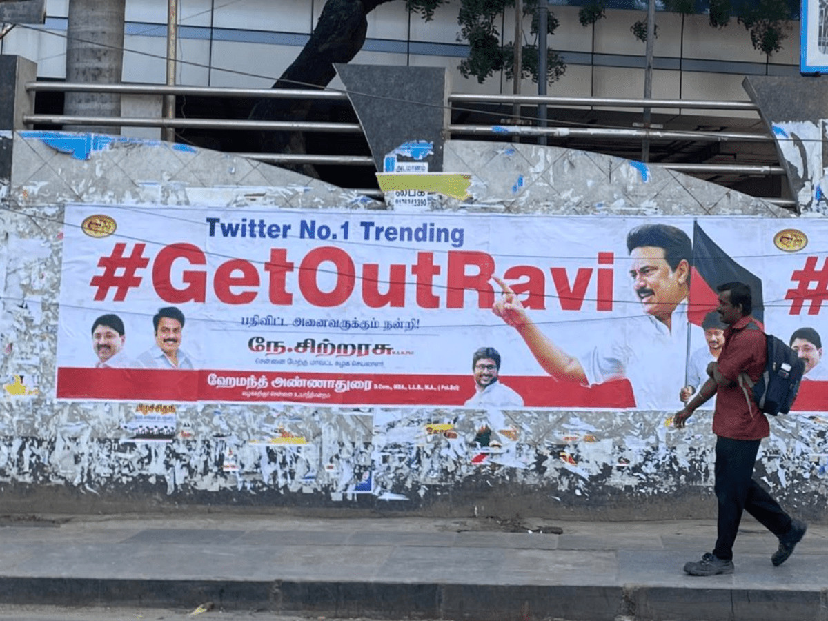 Chennai: A day after the spat between the ruling DMK and Tamil Nadu Governor R N Ravi on the floor of the state assembly, “#GetoutRavi” posters, prominently featuring Chief Minister M K Stalin surfaced in some parts of the city.