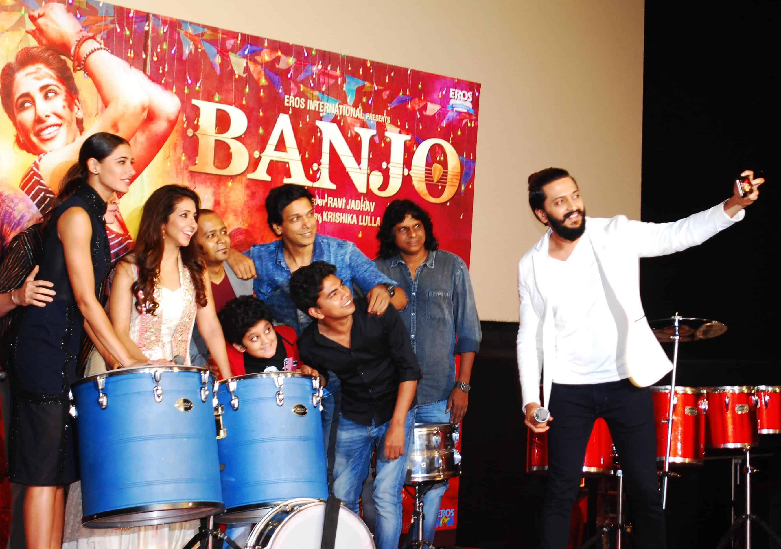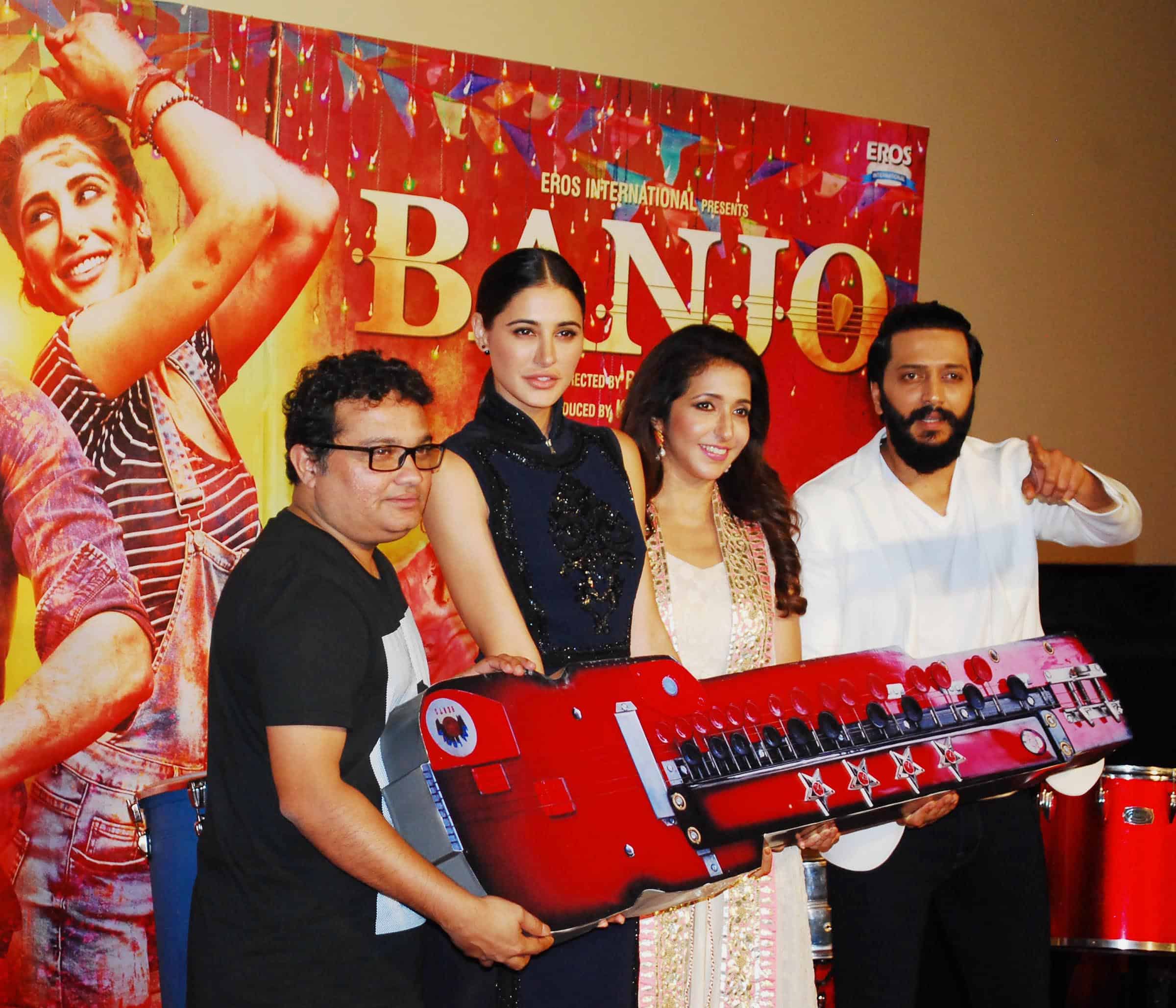 MUMBAI, AUG 9 (UNI):- Bollywood actors Riteish Deshmukh (R) and Nargis Fakhri (2nd L) with director Ravi Jadhav (L) and producer Krishika Lulla (2nd R) during trailer launch of their up coming movie Banjo, in Mumbai on Tuesday.UNI PHOTO-131U