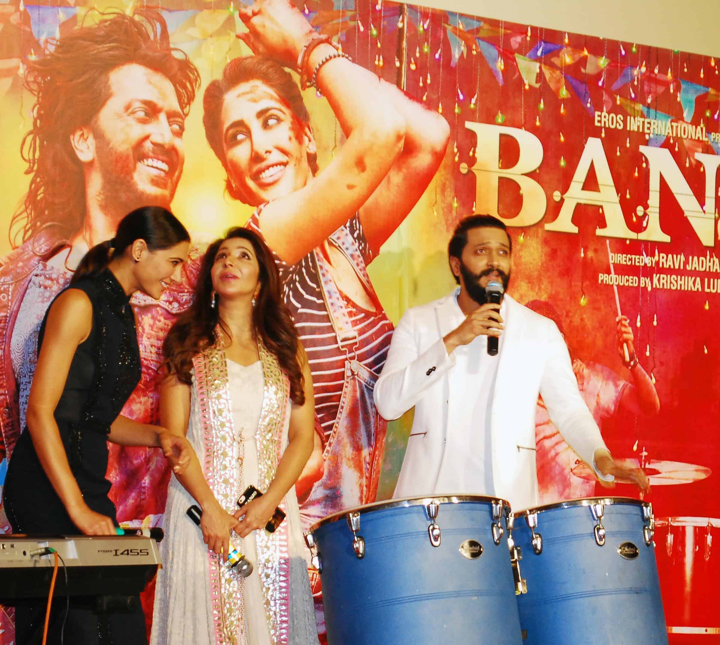 Bollywood actors Nargis Fakhri (L) and Riteish Deshmukh (R) with producer Krishika Lulla (2nd L) during trailer launch of their up coming movie Banjo, in Mumbai on Tuesday.UNI PHOTO