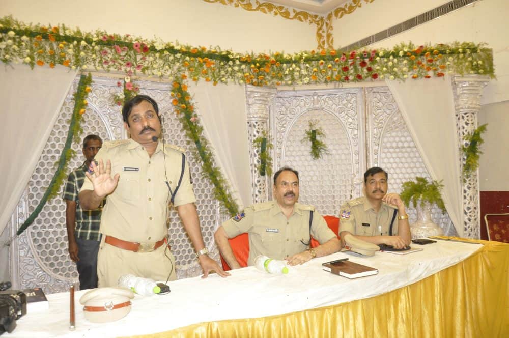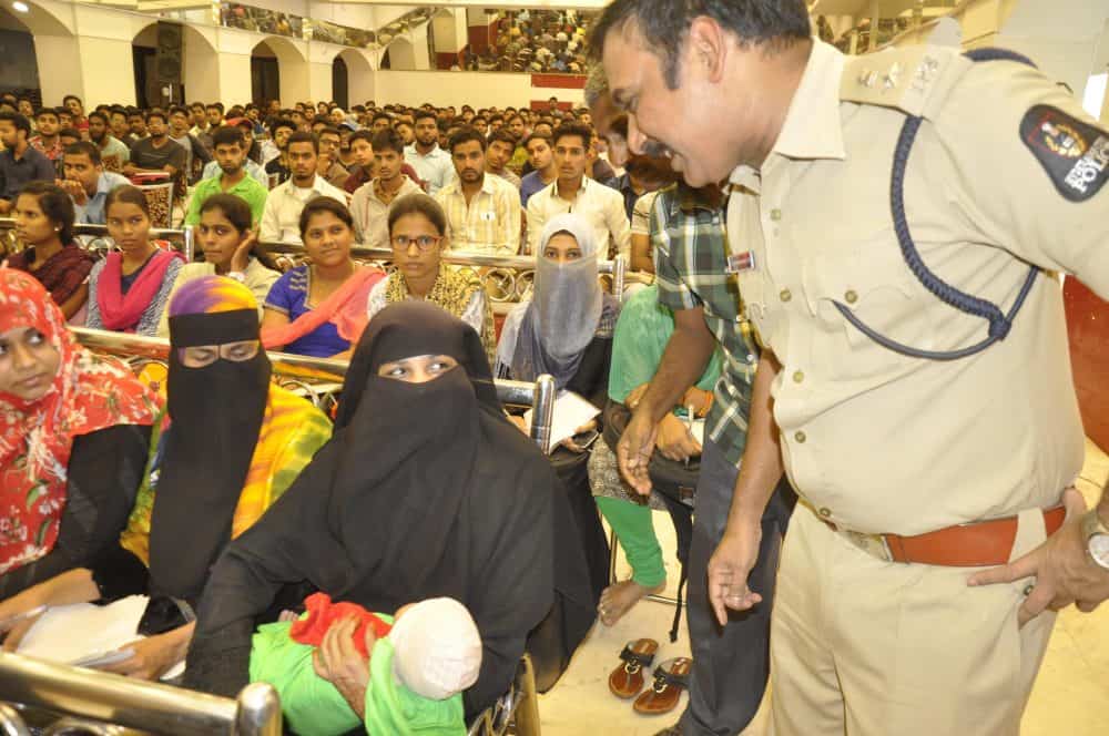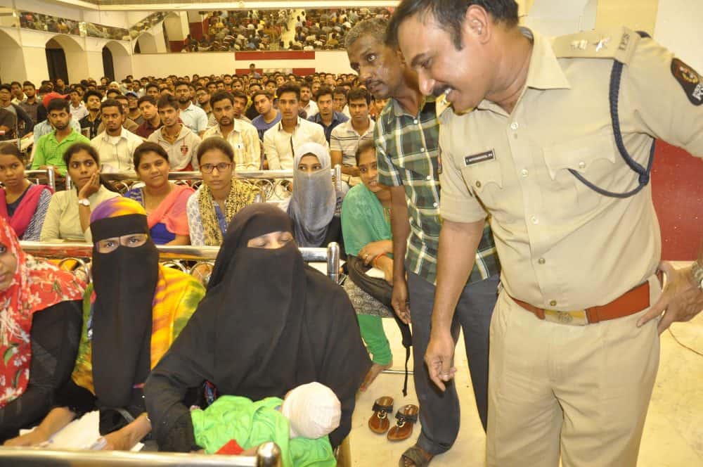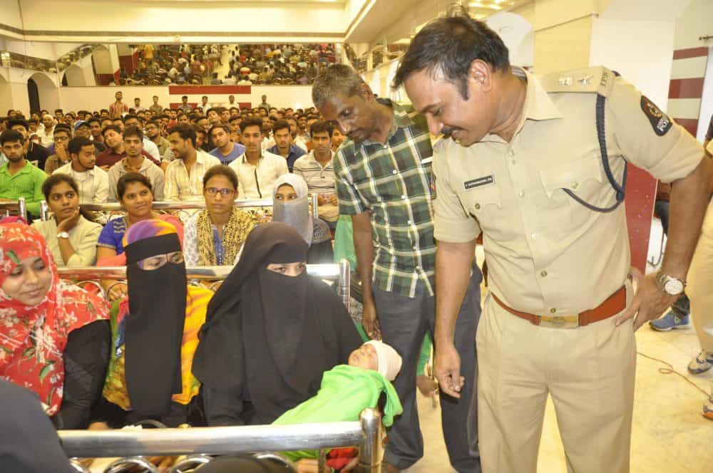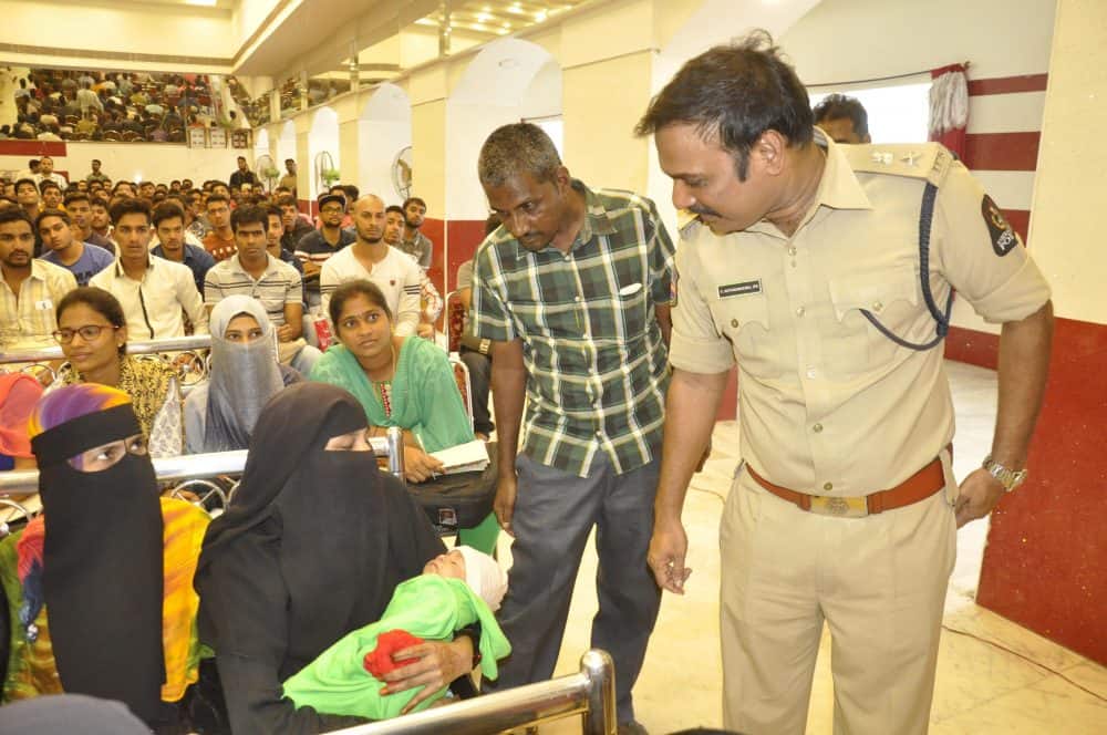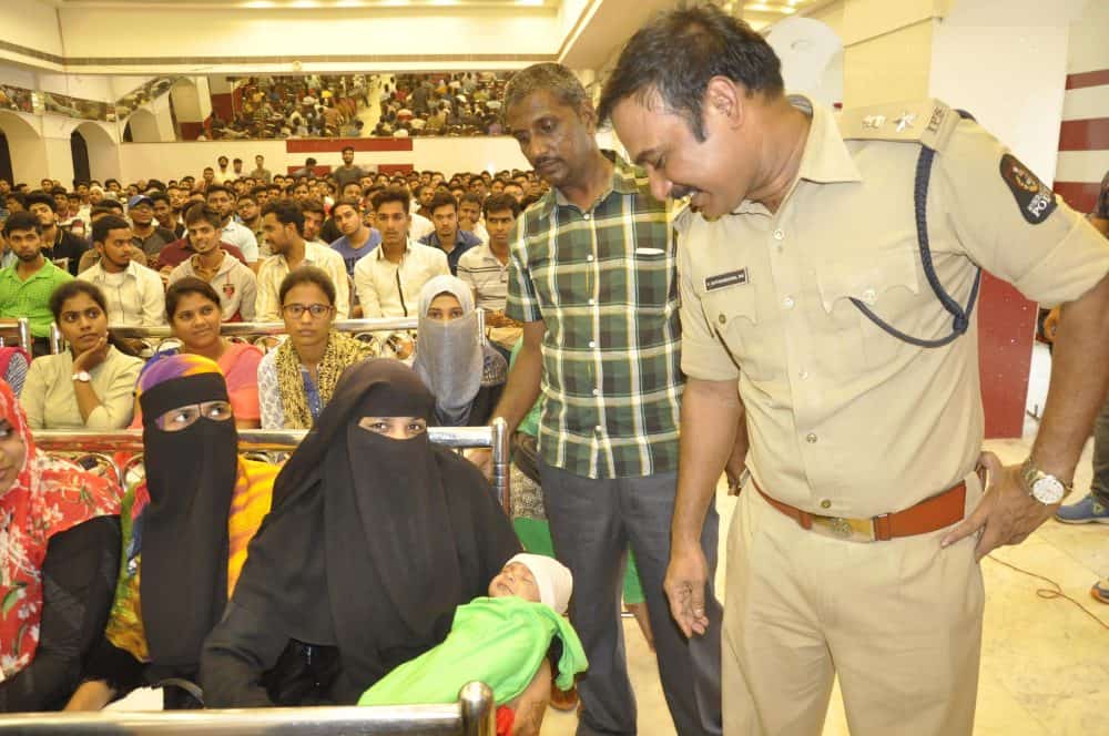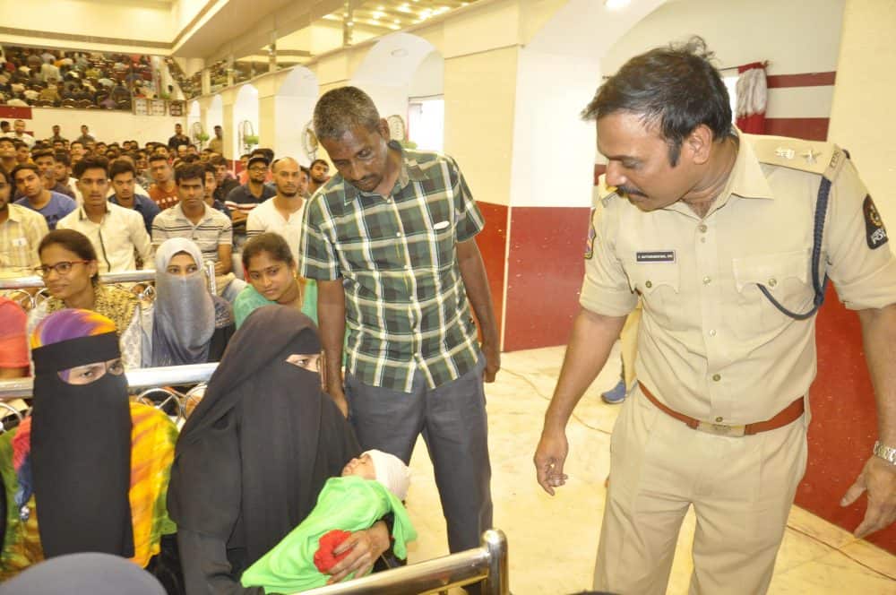 DCP South Zone V. Satyanarayana is seen interacting with an applicant of Police Recruitment who is a mother of an infant during the training session organised by the South Zone City Police in Minar Garden, Hyderabad. (Pics. Mazher)