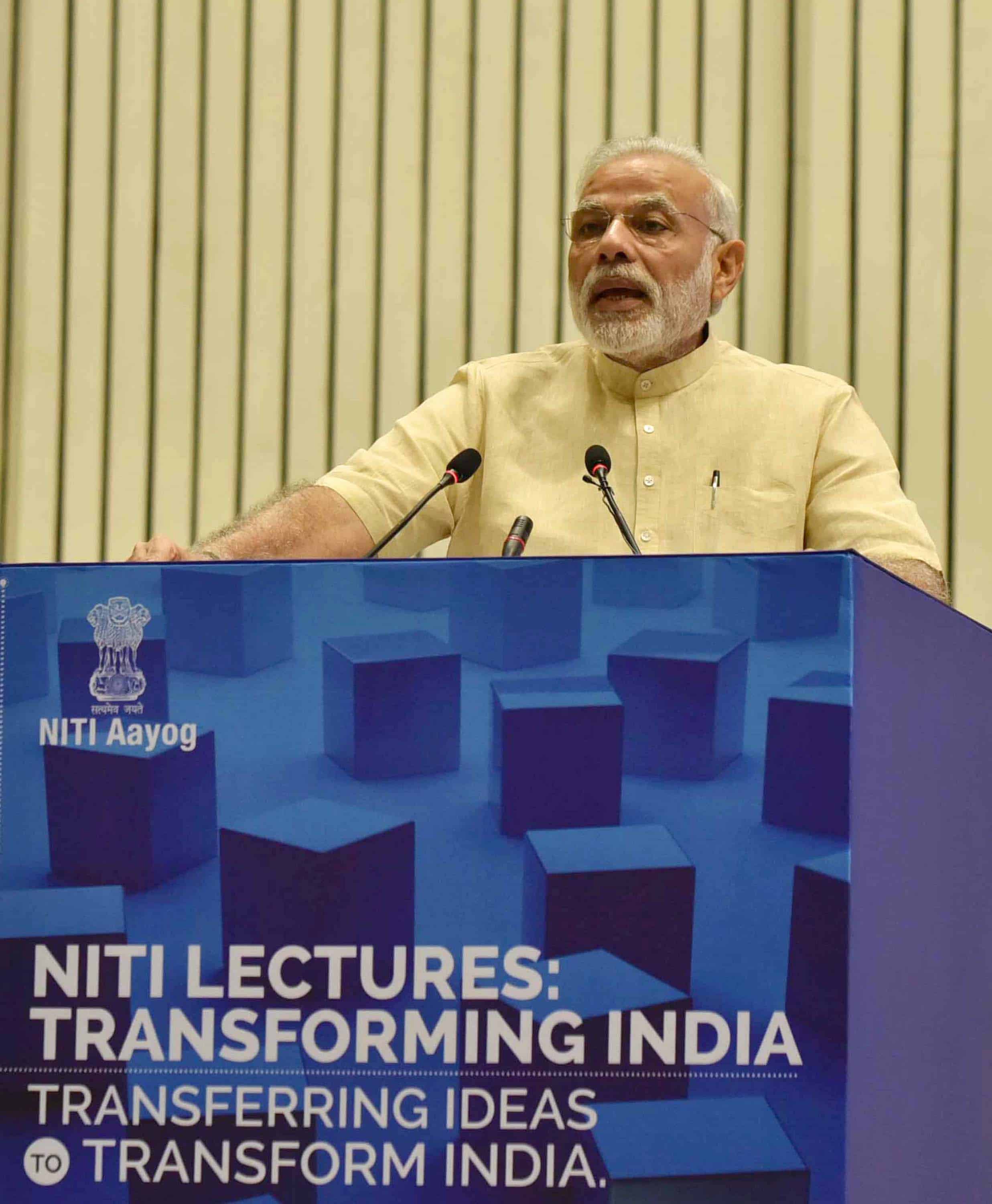 NEW DELHI, AUG 26 (UNI):- Prime Minister Narendra Modi delivering his inaugural address at the NITI Transforming India Lecture Series, in New Delhi on Friday. UNI PHOTO-19U