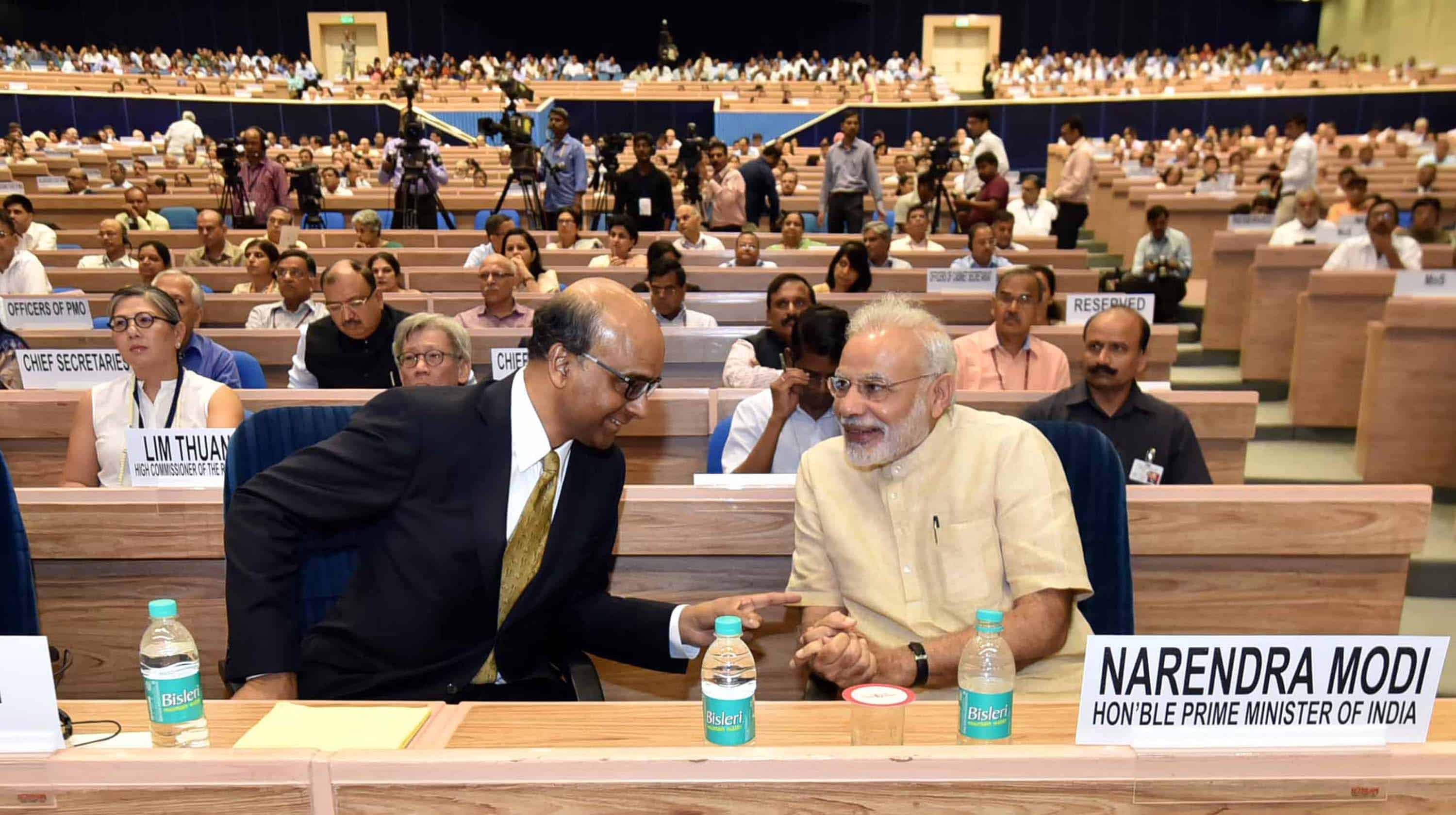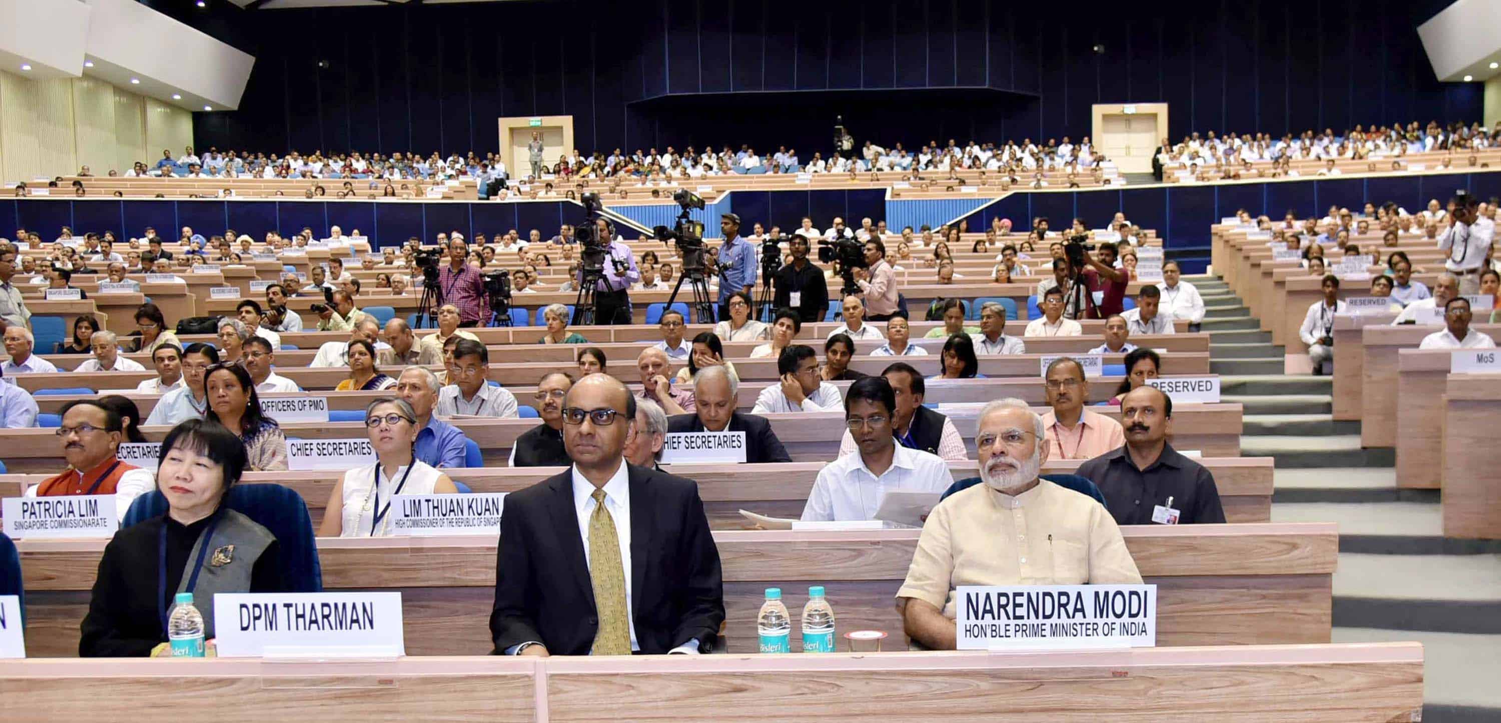 Prime Minister Narendra Modi and Singapore Deputy Prime Minister Tharman Shanmugaratnam at the inauguration ceremony of NITI ‘Transforming India’ Lecture Series, in New Delhi on Friday. UNI PHOTO