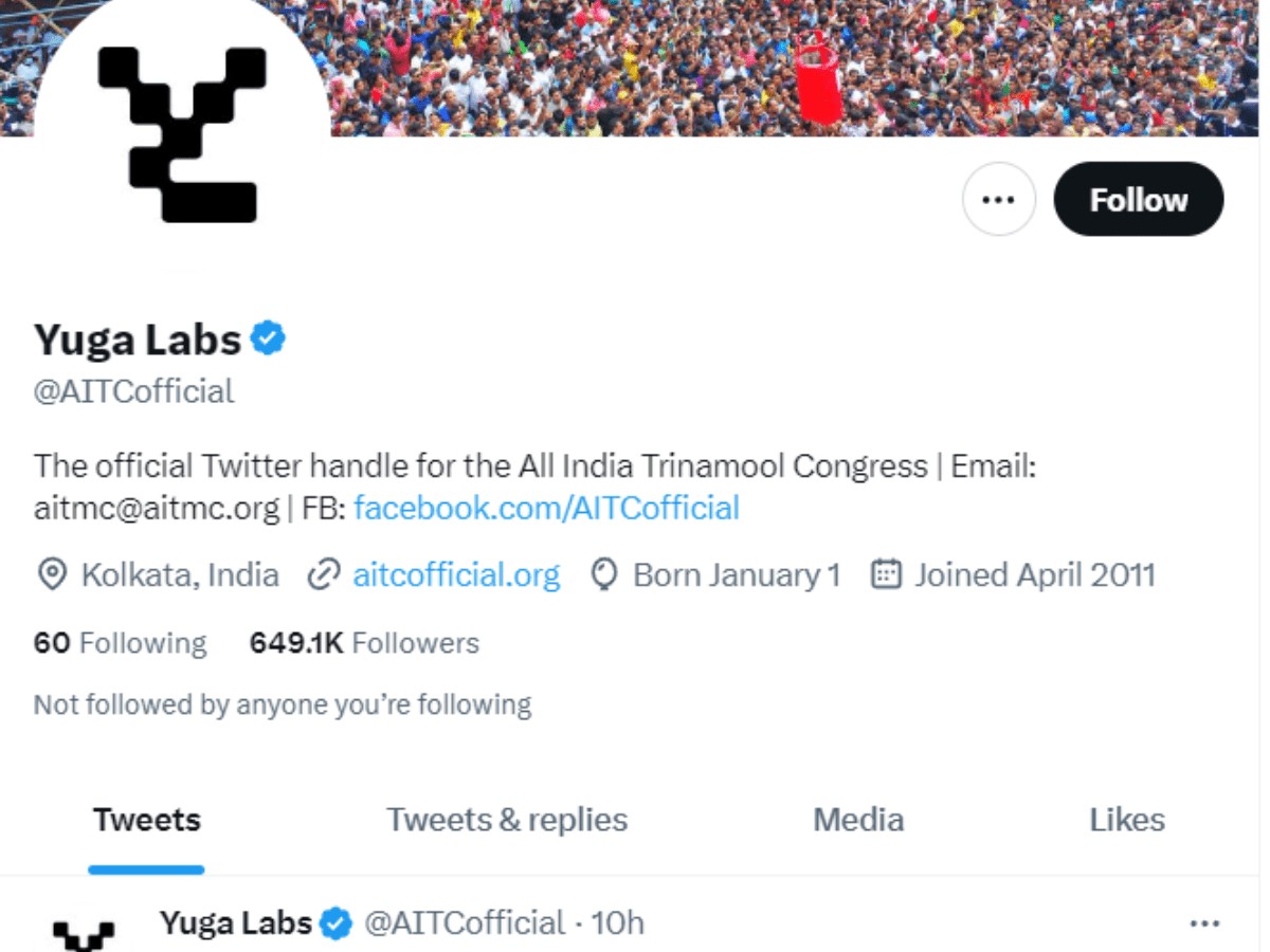 In the hacked handle the name has been changed to “Yuga Labs” and the original party logo has been replaced by a symbolic picture combining the letters “Y” and “L”.