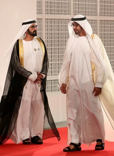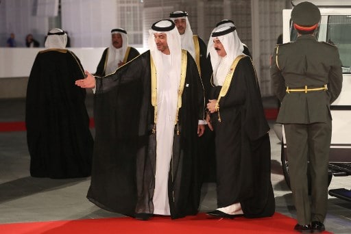 UAE’s Sheikh Hazza bin Zayed al-Nahyan (L) greets Bahrain’s King Hamed bin Isa Al-Khalifa at the entrance of the the Louvre Abu Dhabi Museum on November 8, 2017 during its inauguration on Saadiyat island in the Emirati capital. AFP