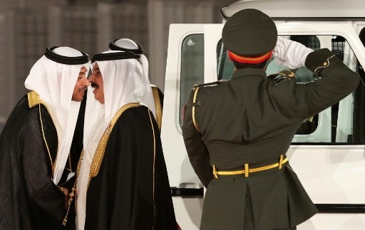 UAE’s Sheikh Hazza bin Zayed al-Nahyan (L) greets Bahrain’s King Hamed bin Isa Al-Khalifa at the entrance of the the Louvre Abu Dhabi Museum on November 8, 2017 during its inauguration on Saadiyat island in the Emirati capital.