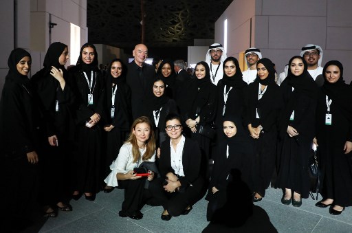 French architect Jean Nouvel (C) poses for a photo with workers from the museum during the inauguration of the Louvre Abu Dhabi Museum on Saadiyat island in the Emirati capital on November 8, 2017. AFP