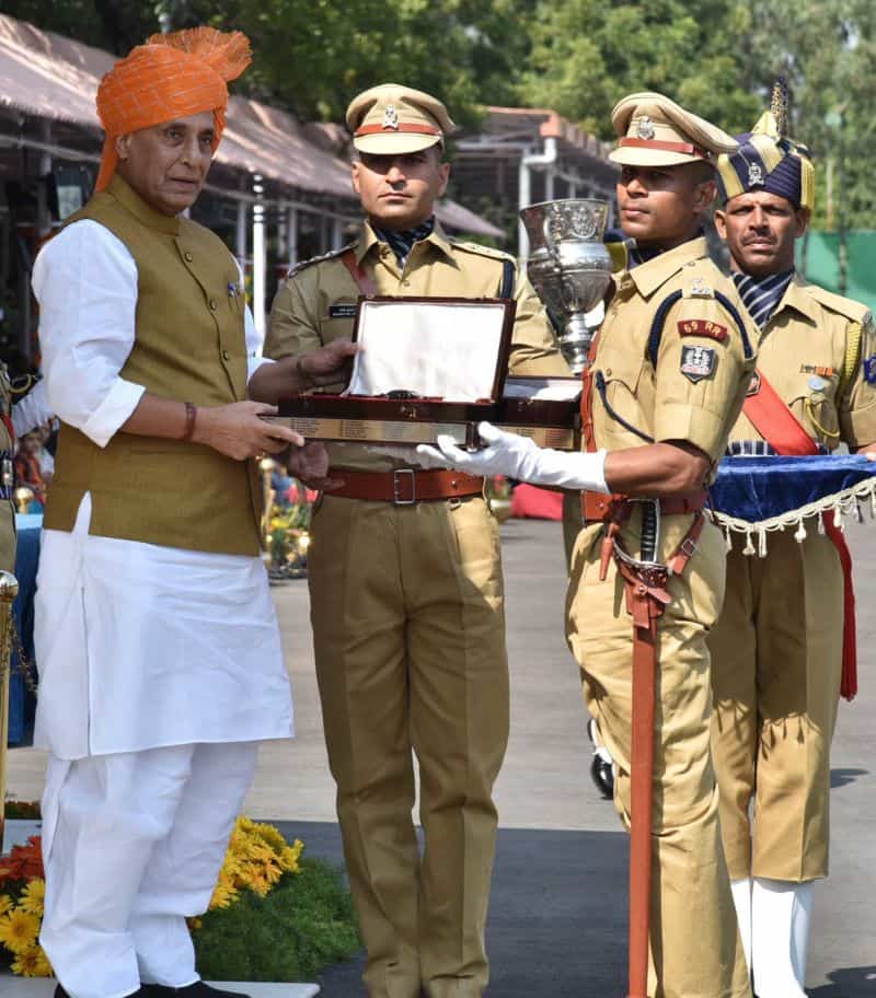 Ms.Amrita Duhan (RJ) receiving the Shri.Bhubanananda Mishra Memorial Trophy for the second best All round Probationer from Union Home Minister Rajnath Singh at the Sardar Vallabhbhai Patel National Police Academy (SVP NPA) in Hyderabad on Monday.
