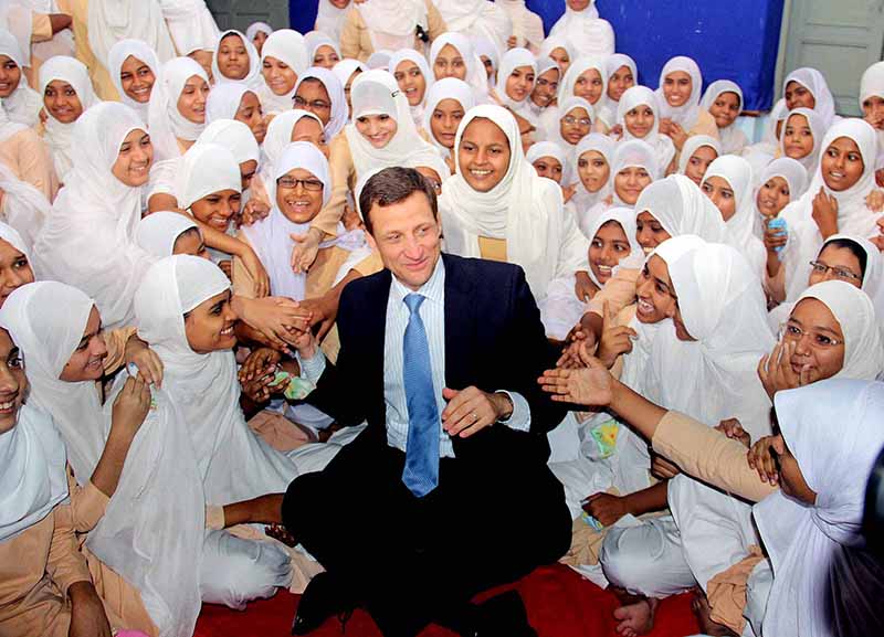 US Consul General Thomas Vajda meets students at the Anjuman-E-Islam school during an educational visit in Ahmedabad on Wednesday.UNI PHOTO