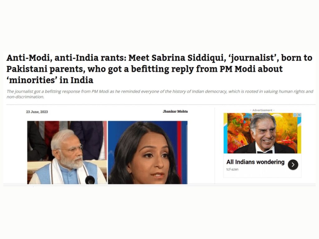 “For the uninitiated, the journalist who went on to pose the cleverly manufactured question echoing the claims of Islamists and left-liberals; alleging persecution of Muslims in India, was none other than Sabrina Siddique….is the daughter of Pakistani parents,” the OpIndia article read.