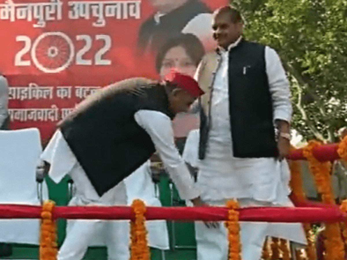 Mainpuri: After almost six years of strained relations, Samajwadi Party president Akhilesh Yadav on Sunday touched the feet of his estranged uncle Shivpal Yadav on stage at an election meeting in Mainpuri.