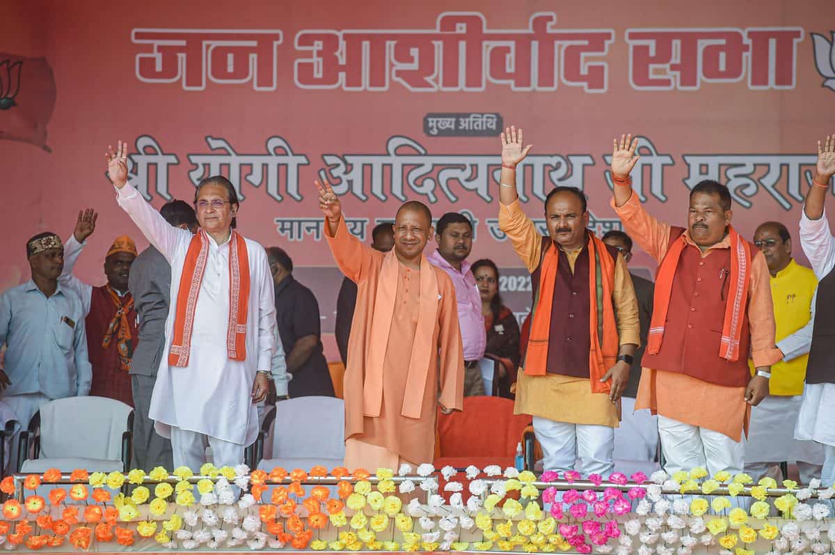 Gorakhpur: Supporters attend a public meeting UP Chief Minister Yogi Adityanath (unseen) for the ongoing UP Assembly elections at Sidharth Nagar, in Gorakhpur, Tuesday, March. 01, 2022. (PTI Photo/Arun Sharma)