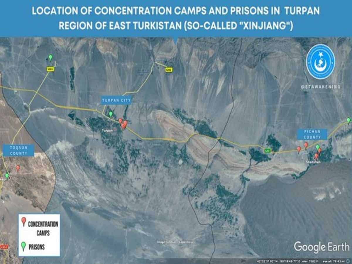 ETNAM had publicly released the coordinates of 182 concentration camps, 209 prisons and 74 Bingtuan (Xinjiang Production and Construction Corps) labour camps across East Turkistan in November last year. The group has now shared the exact locations of 10 concentration camps and five prisons located nearly 130 kilometres radius of Turpan region.