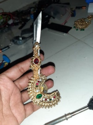 The steel knife weights just 70 grams and has been fitted into a large-size piece of jewellery. It took one month to make the prototype at an expense of Rs. 1500.