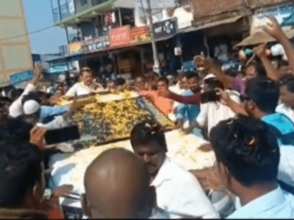 Virupakshappa waved at his supporters from his open vehicle throughout the procession. Later, he went to Chennakeshava temple and sought blessings after offering special worship. His supporters with BJP flags thronged both sides of the road, showered flowers and cheered him.