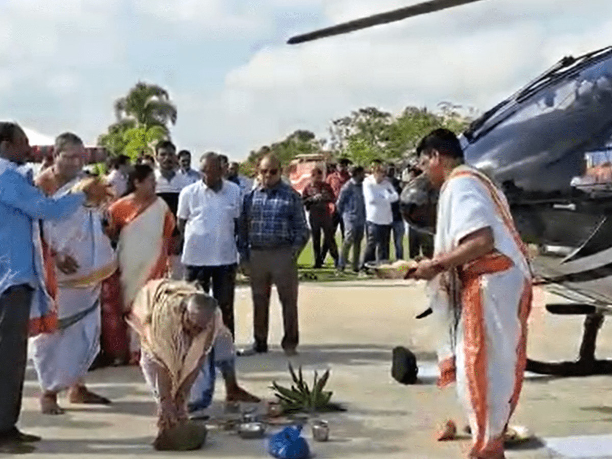Hyderabad: People bringing their newly purchased two-wheelers and four-wheelers to temples for ‘vahan puja’ (vehicle puja) is a common sight but this businessman from Telangana took his newly-bought helicopter to a temple for performing the rituals.