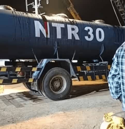 The image portrays a massive water tanker with the words “NTR30” written on it and a red liquid dripping over it, which is thought to be blood for an intense action sequence. The rumour that the film would begin with special action scenes has only added to the fans’ excitement.